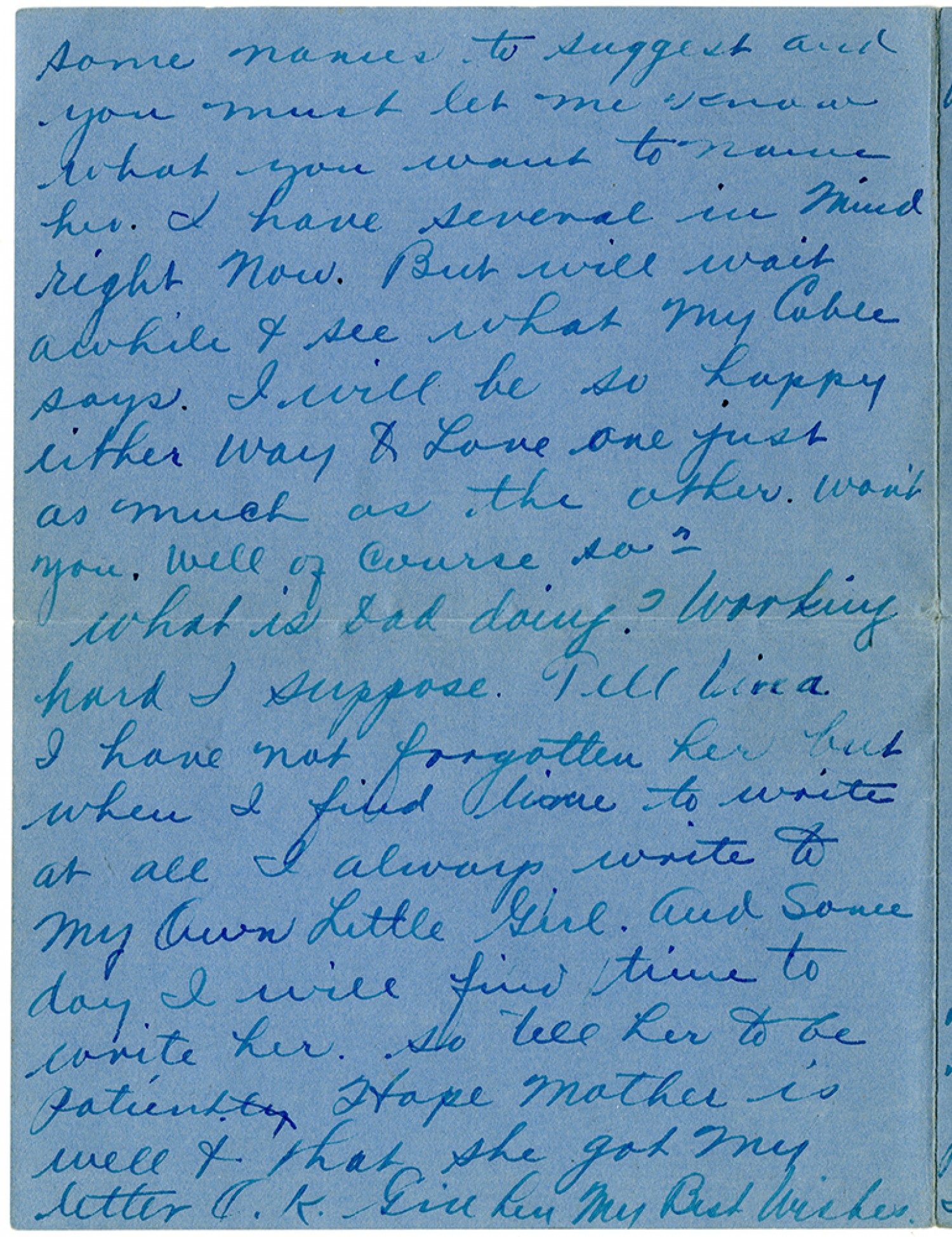 some names to suggest and you must let me know what you want to name her. I have several in mind right now. But will wait awhile & see what my Cable says. I will be so happy either way & Love one just as much as the other. won't you. well of course so. what is Dad doing? Working hard I suppose. Tell Viola I have not forgotten her but when I find time to write at all I always write to my own Little Girl. And some day I will find time to write her. so tell her to be patient. Hope Mother is well & that she got my letter O.K. Give her my Best Wishes.