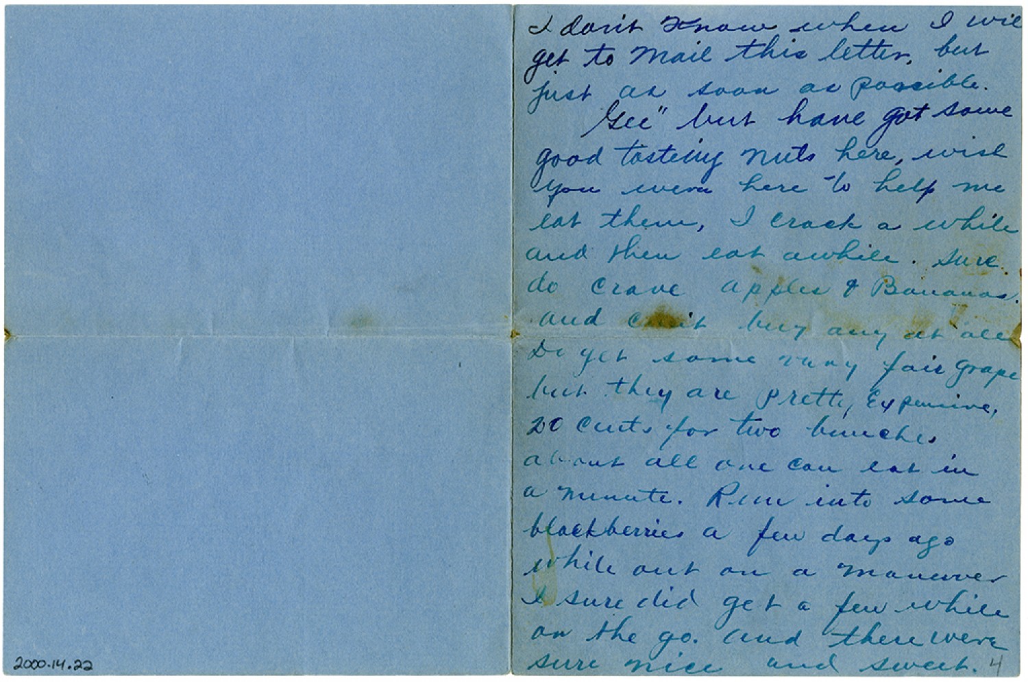 I don't know when I will get to mail this letter, but just as soon as possible. "Gee" but have got some good tasteing nuts here, wish you were here to help me eat them, I crack a while and then eat awhile. sure do crave apples & Bananas and can't buy any at all Do get some very fair grapes but they are pretty expensive, 20 cents for two bunches about all one can eat in a minute. Run into some blackberries a few days ago while out on a maneuver I sure did get a few while on the go, and there were sure nice and sweet.