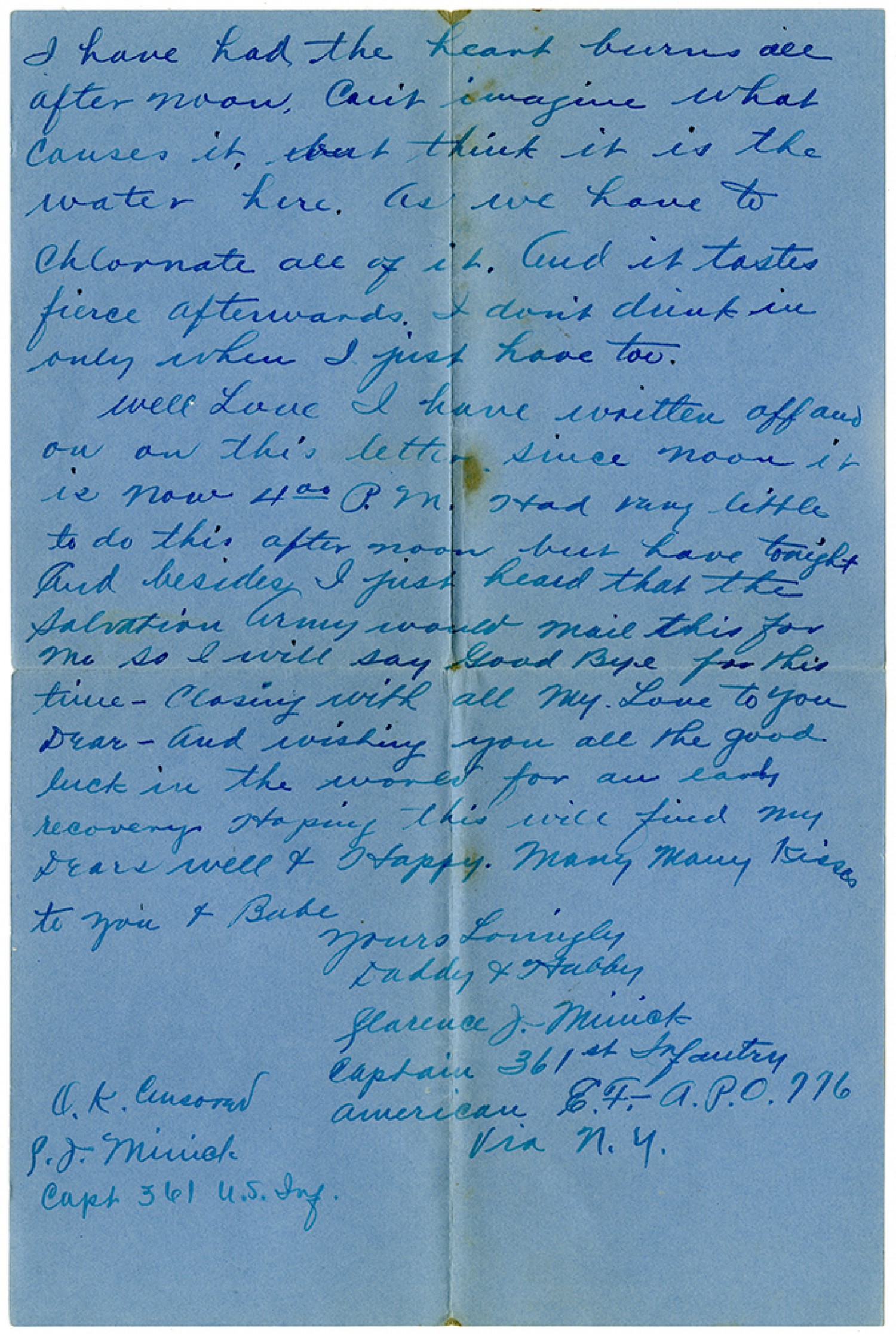I have had the heart burns all after noon. Can't imagine what causes it, but think it is the water here, as we have to chlornate all of it. And it tastes fierce afterwards. I don't drink in only when I just have too. Well Love I have written off an on on this letter. since noon it is now 4:00 P.M. Had very little to do this afternoon but have tonight and besides I just heard that the salvation army would mail this for me so I will say Good Bye for this time. Closing with all my Love to you Dear - and wishing you all the good luck in the world for an early recovery Hoping this will find my dears well & Happy. Many Many kisses to you & Babe. Yours Lovingly Daddy & Hubby Clarence J. Minick Captain 361st Infantry American E.F. A.P.O. 776 Via [New York] O.K. Censored C.J. Minick Capt 361 U.S. Inf.
