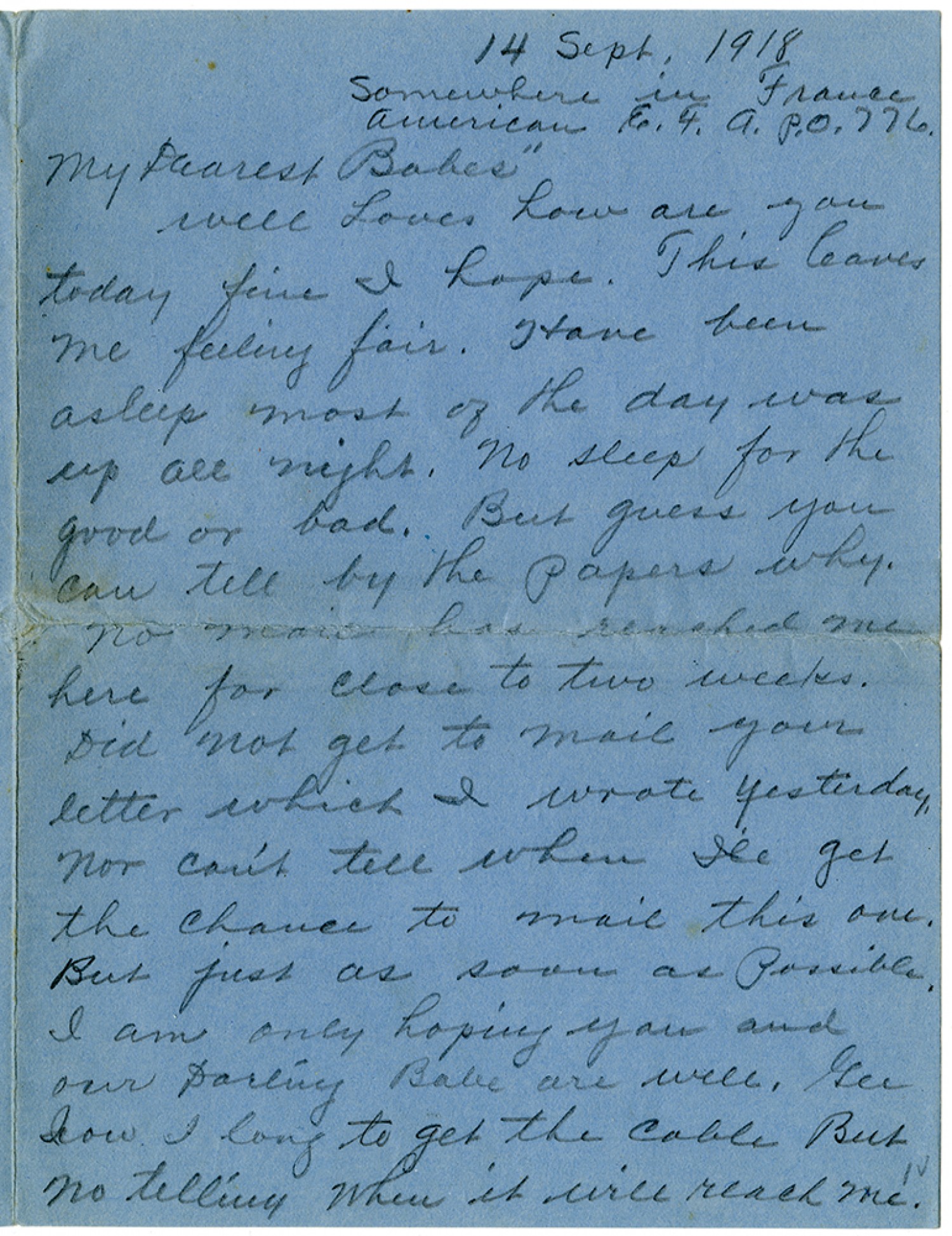 14 [September] 1918 Somewhere in France American E.F. A.P.O. 776. My Dearest Babes” well Loves how are you today fine I hope. This leaves me feeling fair. Have been asleep most of the day was up all night. No sleep for the good or bad. But guess you can tell by the papers why. no mail has reached me here for close to two weeks. Did not get to mail your letter which I wrote yesterday nor can't tell when I'll get the chance to mail this one. But just as soon as possible. I am only hoping you and our Darling Babe are well. Gee how I long to get the cable But no telling when it will reach me.