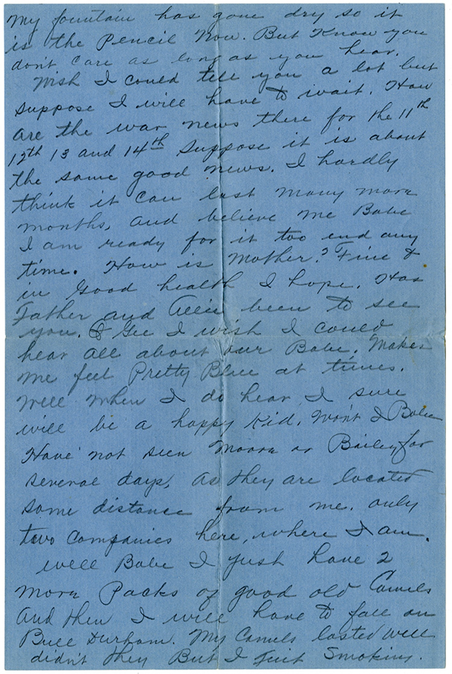 my fountain has gone dry so it is the pencil now. But know you don't care as long as you hear. Wish I could tell you a lot but suppose I will have to wait. How are the war news there for the 11th 12th 13 and 14th suppose it is about the same good news. I hardly think it can last many more months, and believe me Babe I am ready for it too end any time. How is mother? Fine & in good health I hope. Has Father and Allie been to see you. 7 Gee I wish I could hear all about our Babe. Makes me feel pretty Blue at times. Well when I do hear I sure will be a happy kid. won't I Babe. Have not seen Moore or Bailey for several days, as they are located some distance from me. only two companies here where I am. well Babe I just have 2 more packs of good old Camels and then I will have to fall on Bull Durham. My Camels lasted well didn't they But I quit smoking.