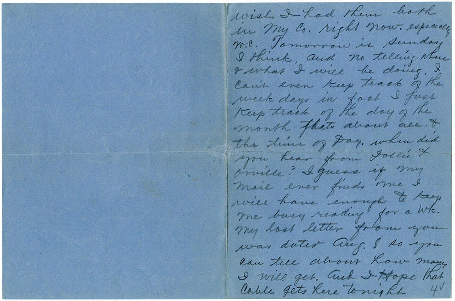 wish I had them both in my Co. right now, especially W.C. Tomorrow is Sunday I think, and no telling where & what I will be doing. I can't even keep track of the week days in fact I just keep track of the day of the month thats about all & the time of Day. when did you hear from Jollie & Orville? I guess if my mail ever finds me I will have enough to keep me busy reading for a wk. My last letter from you was dated [August] 8 so you can tell about how many I will get. And I Hope that cable gets here tonight.