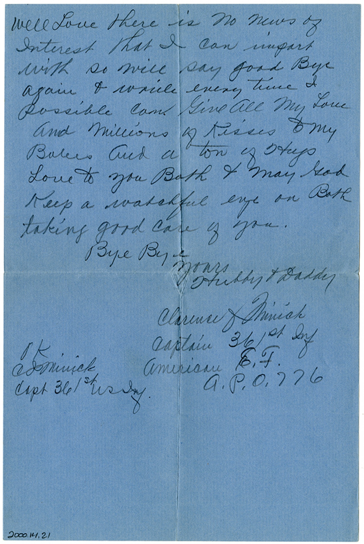 Well Love there is No News of Interest that I can impart with so will say good Bye again & write every time I possible can. Give All My Love and Millions of Kisses to my Babes And a ton of [ms illegible: 1 wd] Love to you Both & May God Keep a watchful eye on Both taking good care of you. Bye Bye Yours Hubby & Daddy Clarence J Minich Captain 361st Inf American E.F. A.P.O. 776 OK CJMinick Capt 361st US Inf.