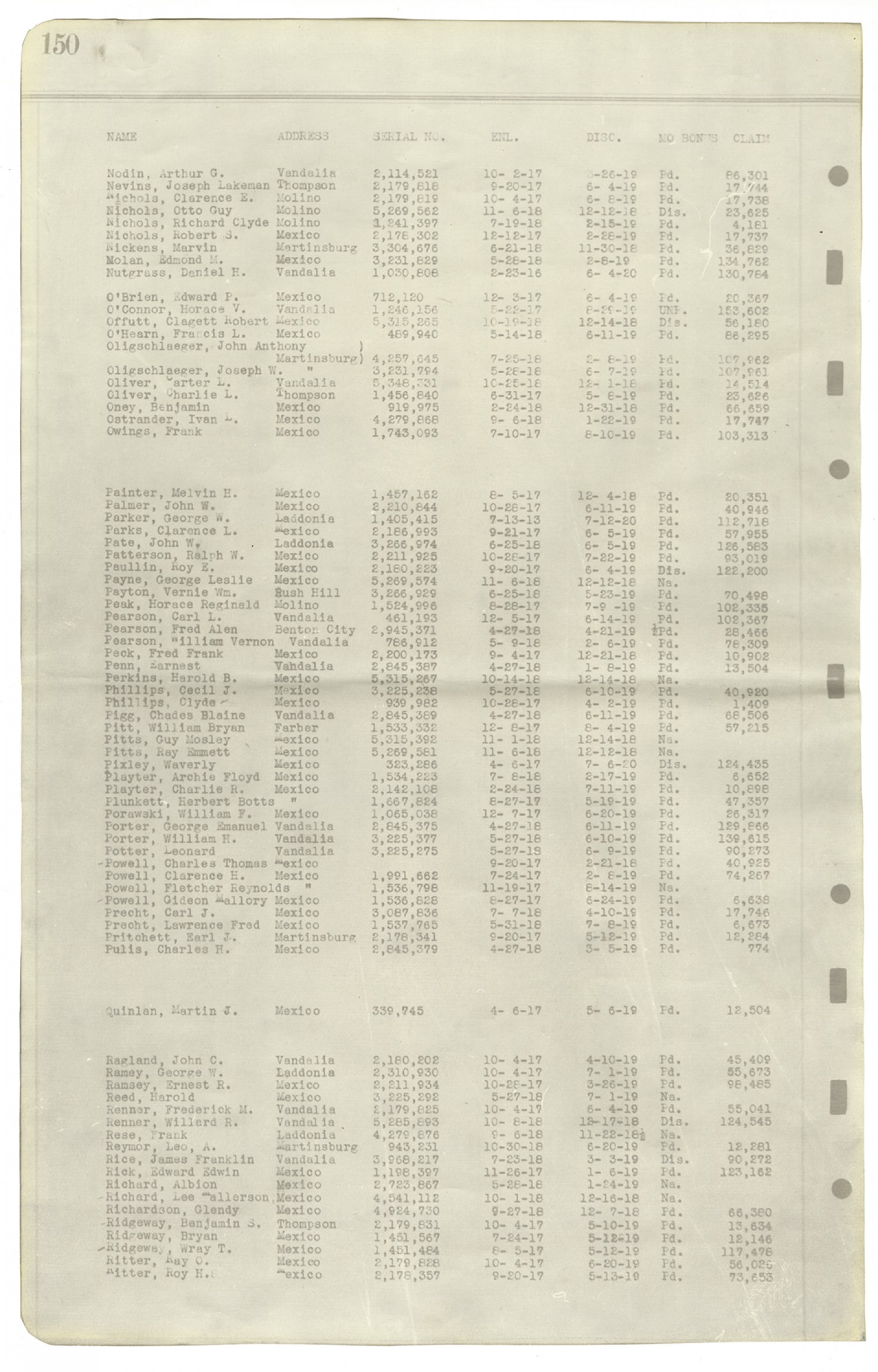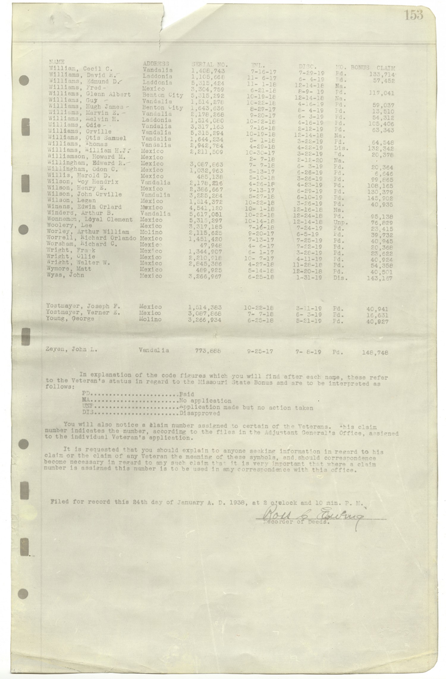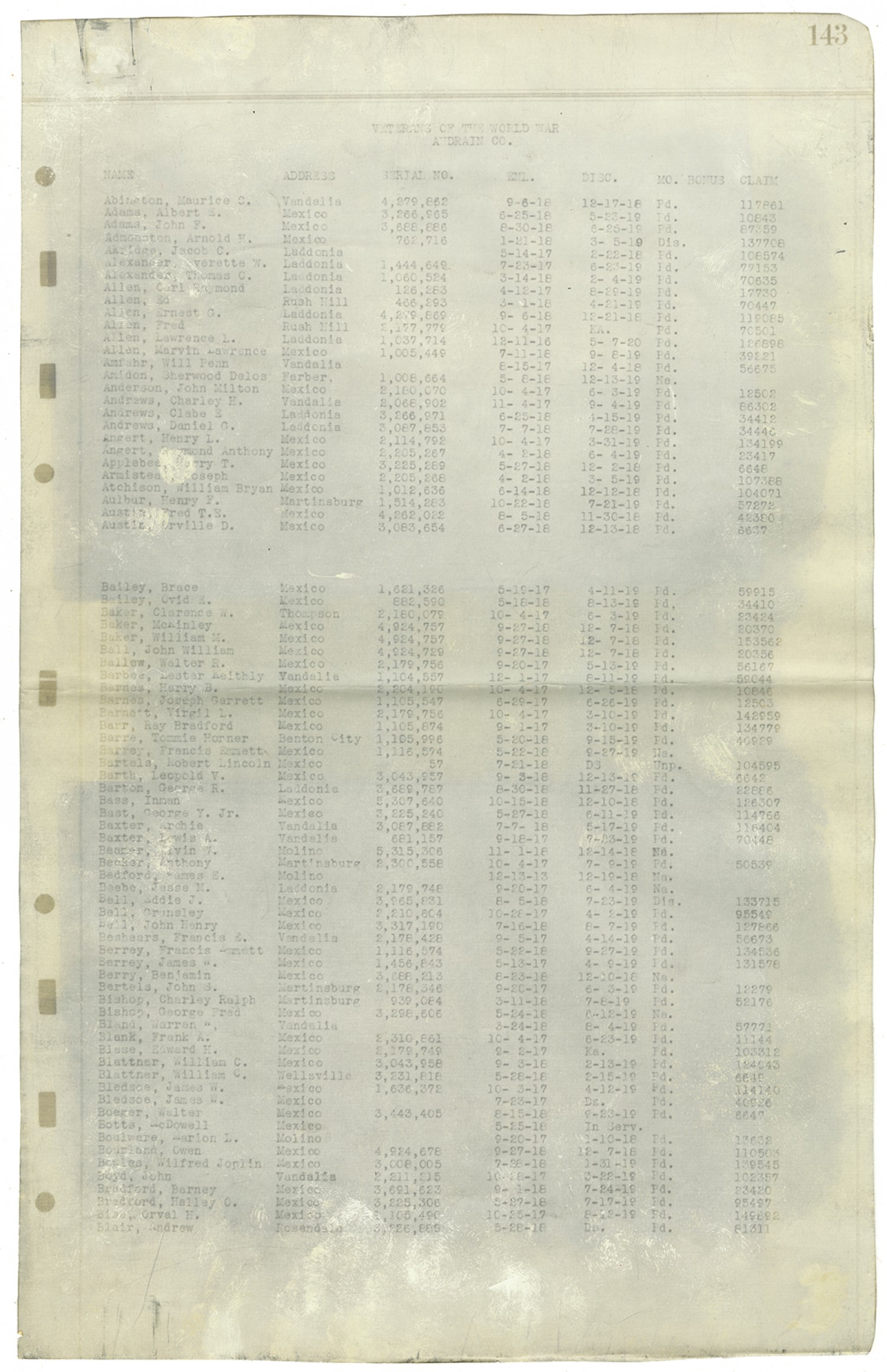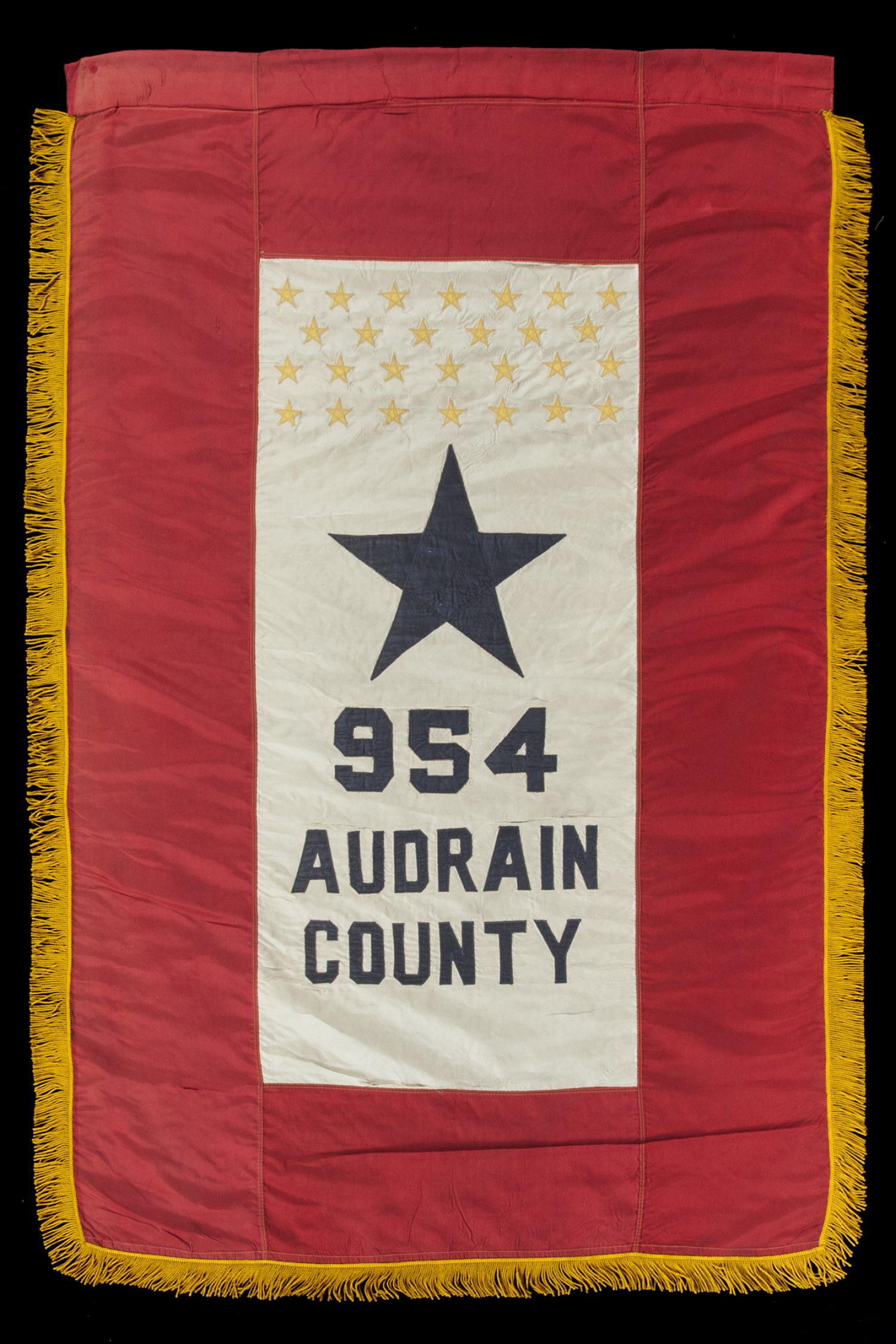 County service banner for Audrain County. Audrain County had 954 men serve and 27 die in the service. In the 1920s, the Missouri Legislature wanted to honor the state’s veterans of the Great War. They appropriated money to match that raised by individual counties to create Service Banners representing the servicemen and women from each county. In 1924, sixty-eight counties presented banners to the state. Over the next two decades, several more were presented. Today the banners in the Missouri State Museum’s collection represent ninety-eight counties plus the City of St. Louis.