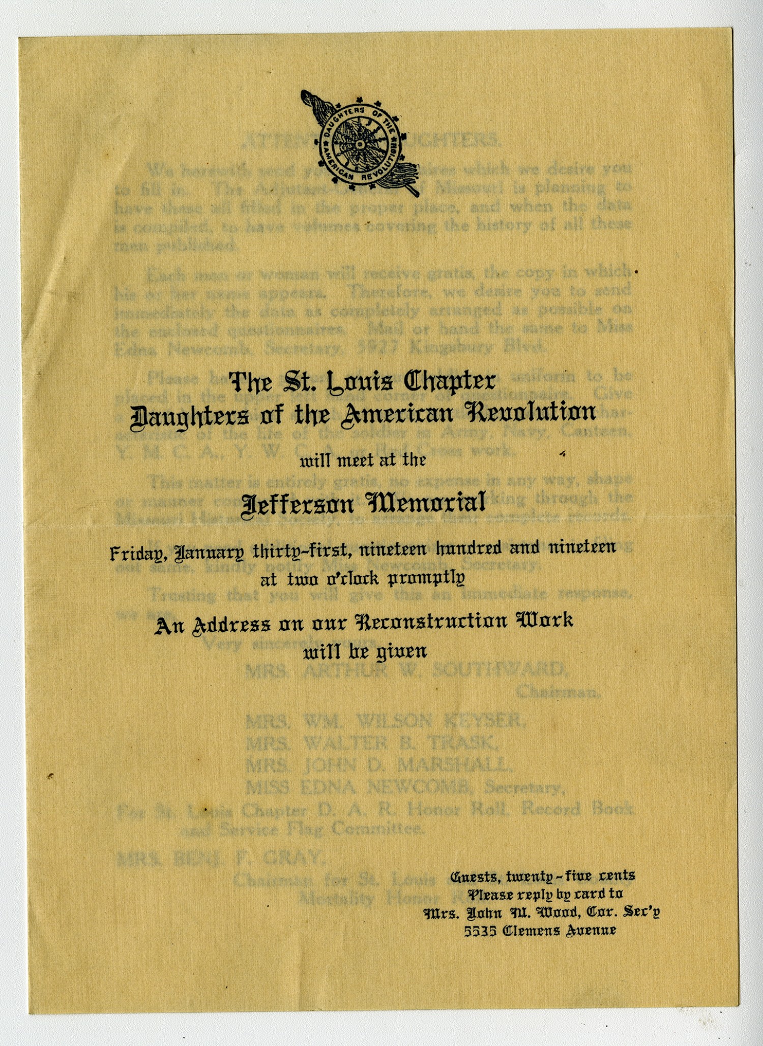 | Source | Southward, Mrs. Arthur W. Announcement for Daughters of the American Revolution Meeting. 31 January 1919. World War I Collection. A1771. Missouri History Museum, St. Louis, Missouri. |