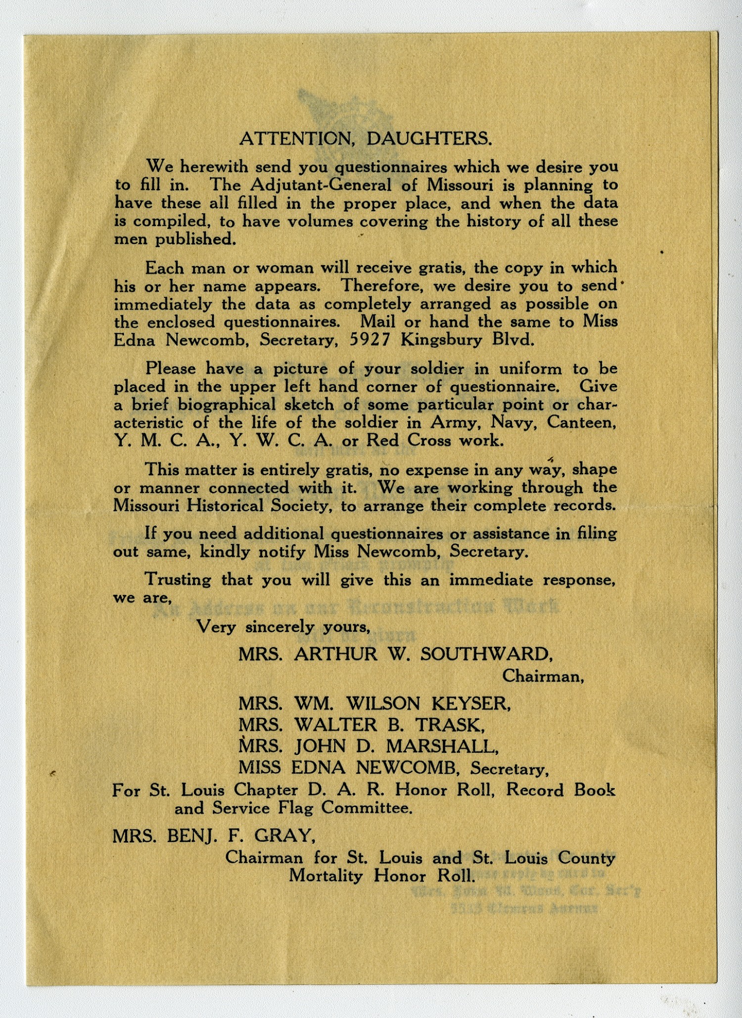 Attention, Daughters. We herewith send you questionnaires which we desire you to fill in. The Adjutant-General of Missouri is planning to have these all filled in the proper place, and when the data is compiled, to have volumes covering the history of all these men published. Each man or woman will receive gratis, the copy in which his or her name appears. Therefore, we desire you to send immediately the data as completely arranged as possible on the enclosed questionnaires. Mail or hand the same to Miss Edna Newcomb, Secretary, 5927 Kingsbury Blvd. Please have a picture of your soldier in uniform to be placed in the upper left hand corner of questionnaire. Give a brief biographical sketch of some particular point or characteristic of life of the soldier in Army, Navy, Canteen, Y.M.C.A., Y.W.C.A. or Red Cross work. This matter is entirely gratis, no expense in any way, shape or manner connected with it. We are working through the Missouri Historical Society, to arrange their complete records. If you need additional questionnaires or assistance in filing out same, kindly notify Miss Newcomb, Secretary. Trusting that you will give this an immediate response, we are, Very sincerely yours, Mrs. Arthur W. Southward, Chairman, Mrs. WM. Wilson Keyser, Mrs. Walter B. Trask, Mrs. John D. Marshall, Miss Edna Newcomb, Secretary, For St. Louis Chapter D.A.R. Honor Roll, Record Book and Service Flag Committee. Mrs. Ben J.F. Gray, Chairman for St. Louis and St. Louis County Mortality Honor Roll.