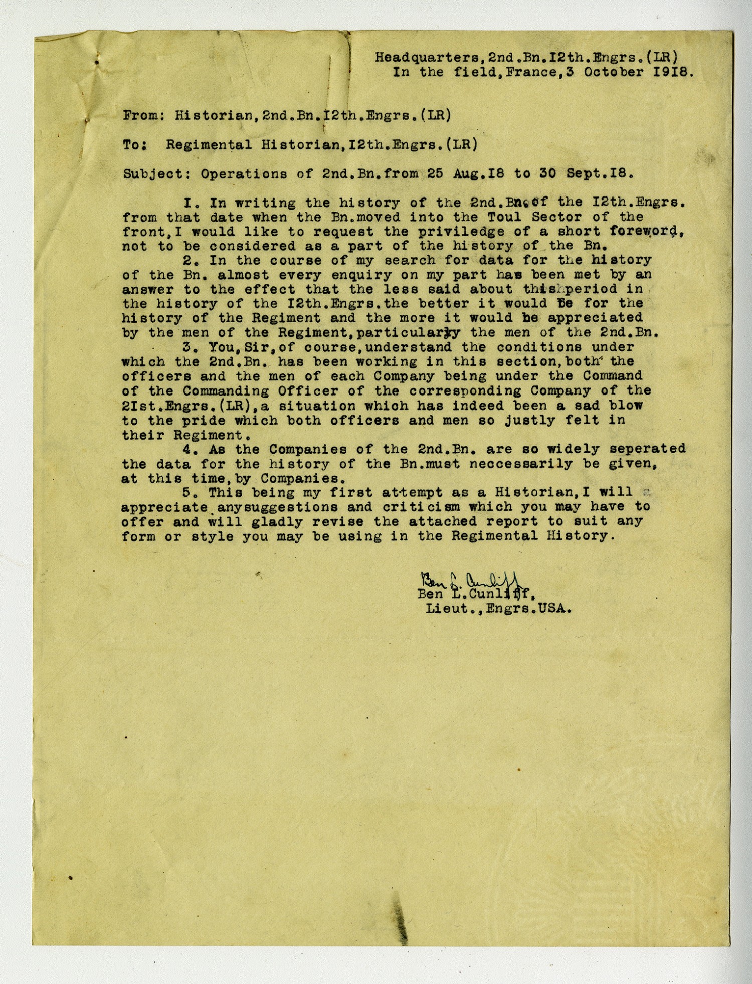 | Title | Ben L. Cunliff to 12th Engineers Regimental Historian - October 3, 1918 |