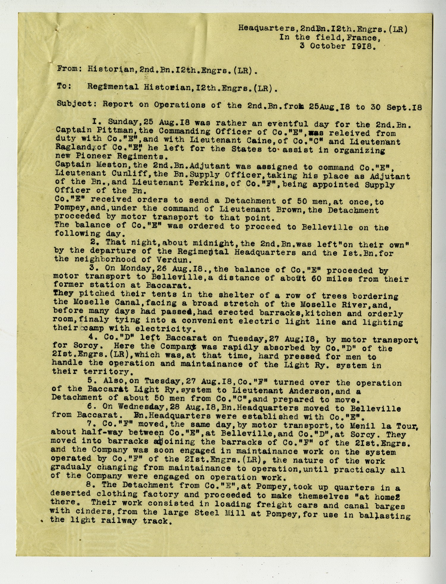 Headquarters, 2nd Bn. 12th Engrs. (LR) In the field, France, 3 October 1918. From: Historian 2nd. Bn. 12th. Engrs. (LR). To: Regimental Historian, 12th. Engrs. (LR). Subject: Report on Operations of the 2nd. Bn. from 25 [August 1918] to 30 [September 1918] I. Sunday, 25 [August 1918] was rather an eventful day for the 2nd. Bn. Captain Pittman, the Commanding Officer of Co.