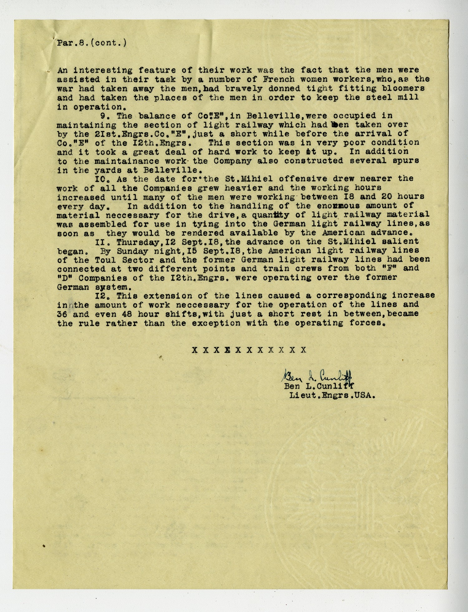 | Description | Letter from Ben L. Cunliff, Historian of the 2nd Bn. 12th Engineers Light Railway to the Regimental Historian of the 12th Engineers reporting the operations of the 2nd Bn. from August 25, 1918 to September 30, 1918. In it, Cunliff described the problems the Unit encountered in preparation for the St. Mihiel Offensive. |