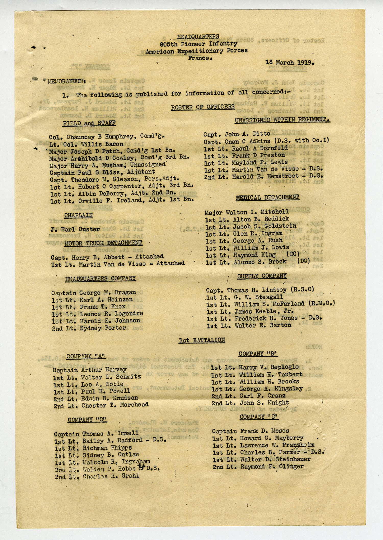 Headquarters 805th Pioneer Infantry American Expeditionary Forces France. 18 March 1919. Memorandum: 1. The following is published for information of all concerned:- Roster of Officers Field and Staff Col. Chauncey B Humphrey, Comd
