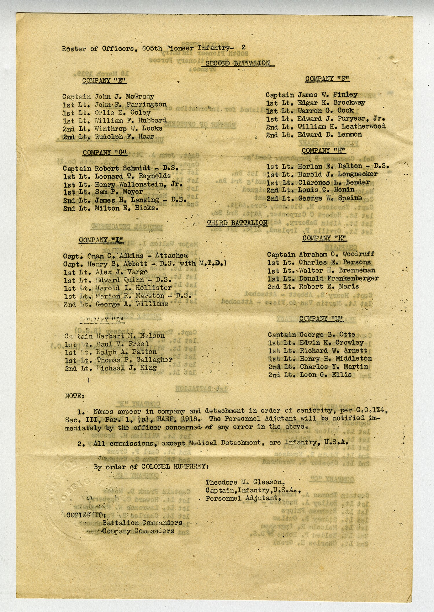Chauncey B. Humphrey Memorandum Roster of Officers - March 18, 1919