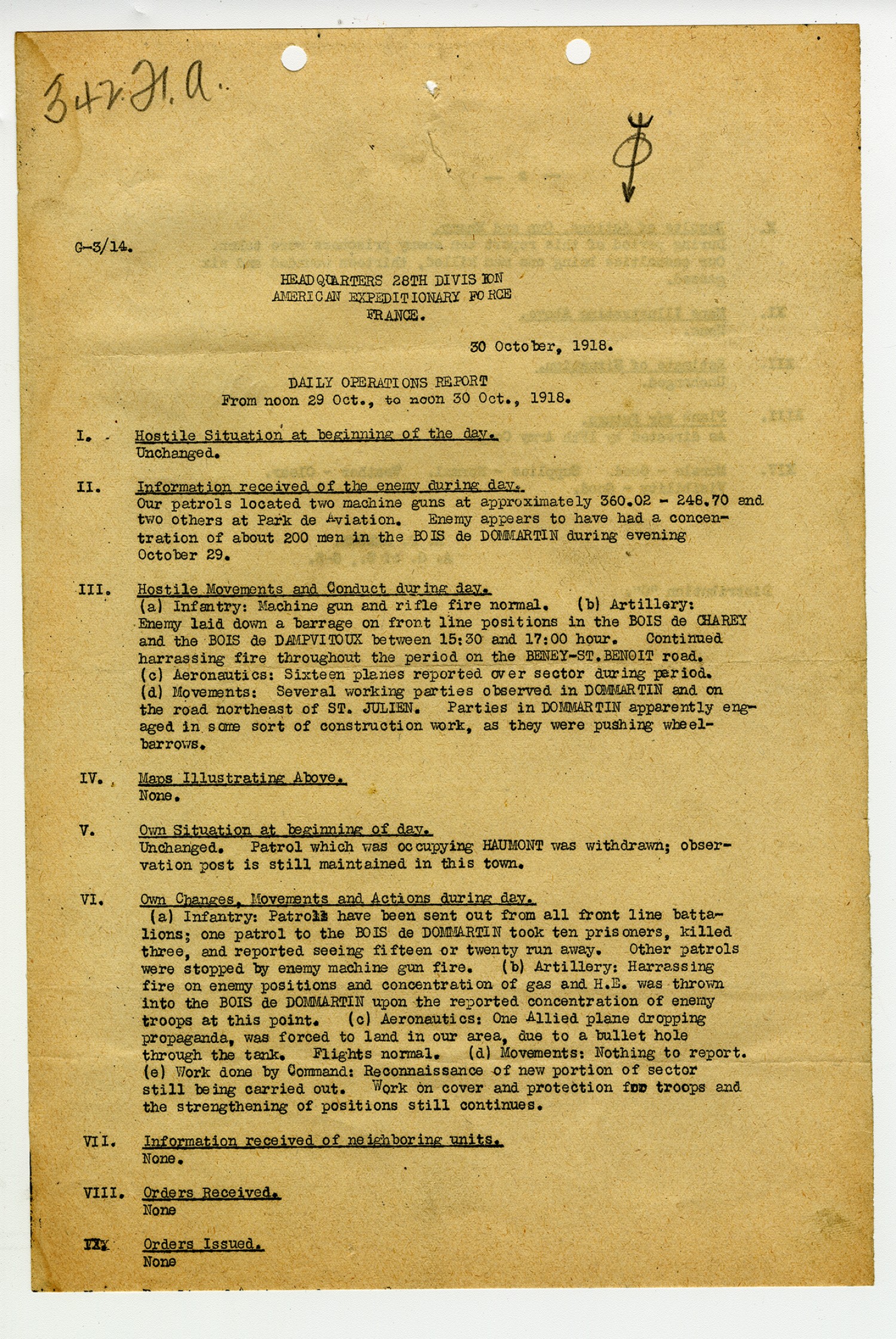 G-3/14. Headquarters 28th Division American Expeditionary Force France. 30 October, 1918. Daily Operations Report From noon 29 [October], to noon 30 [October], 1918. I. Hostile Situation at beginning of the day. Unchanged. II. Information received of the enemy during day. Our patrols located two machine guns at approximately 360.02-248.70 and two others at Park de Aviation. Enemy appears to have had a concentration of about 200 men in the Bois de Dommartin during evening October 29. III. Hostile Movements and Conduct during day. (a) Infantry: Machine guns and rifle fire normal. (b) Artillery: Enemy laid down a barrage on front line positions in the Bois de Charey and the Bois de Dampvitoux between 15:30 and 17:00 hour. Continued harrassing fire throughout the period on the Beney-St. Benoit road. (c) Aeronautics: Sixteen planes reported over sector during period. (d) Movements: Several working parties observed in Dommartin and on the road northeast of St. Julien. Parties in Dommartin apparently engaged in some sort of construction work, as they were pushing wheelbarrows. IV. Maps Illustrating Above. None. V. Own Situation at beginning of day. Unchanged. Patrol which was occupying Haumont was withdrawn; observation post is still maintained in this town. VI. Own Changes, Movements and Actions during day. (a) Infantry: Patrols have been sent out from all front line battalions; one patrol to the Bois de Dommartin took ten prisoners, killed three, and reported seeing fifteen or twenty run away. Other patrols were stopped by enemy machine gun fie. (b) Artillery: Harrassing fire on enemy positions and concentration of gas and H.E. was thrown into the Bois de Dommartin upon the reported concentration of enemy troops at this point. (c) Aeronautics: One Allied plane dropping propaganda, was forced to land in our area, due to a bullet hold through the tank. Flights normal. (d) Movements: Nothing to report. (e) Work done by Command: Reconnaissance of new portion of sector still being carried out. Work on cover and protection for troops and the strengthening of positions still continues. VII. Information received of neighboring units. None. VIII. Orders Received. None IX. Orders Issued None