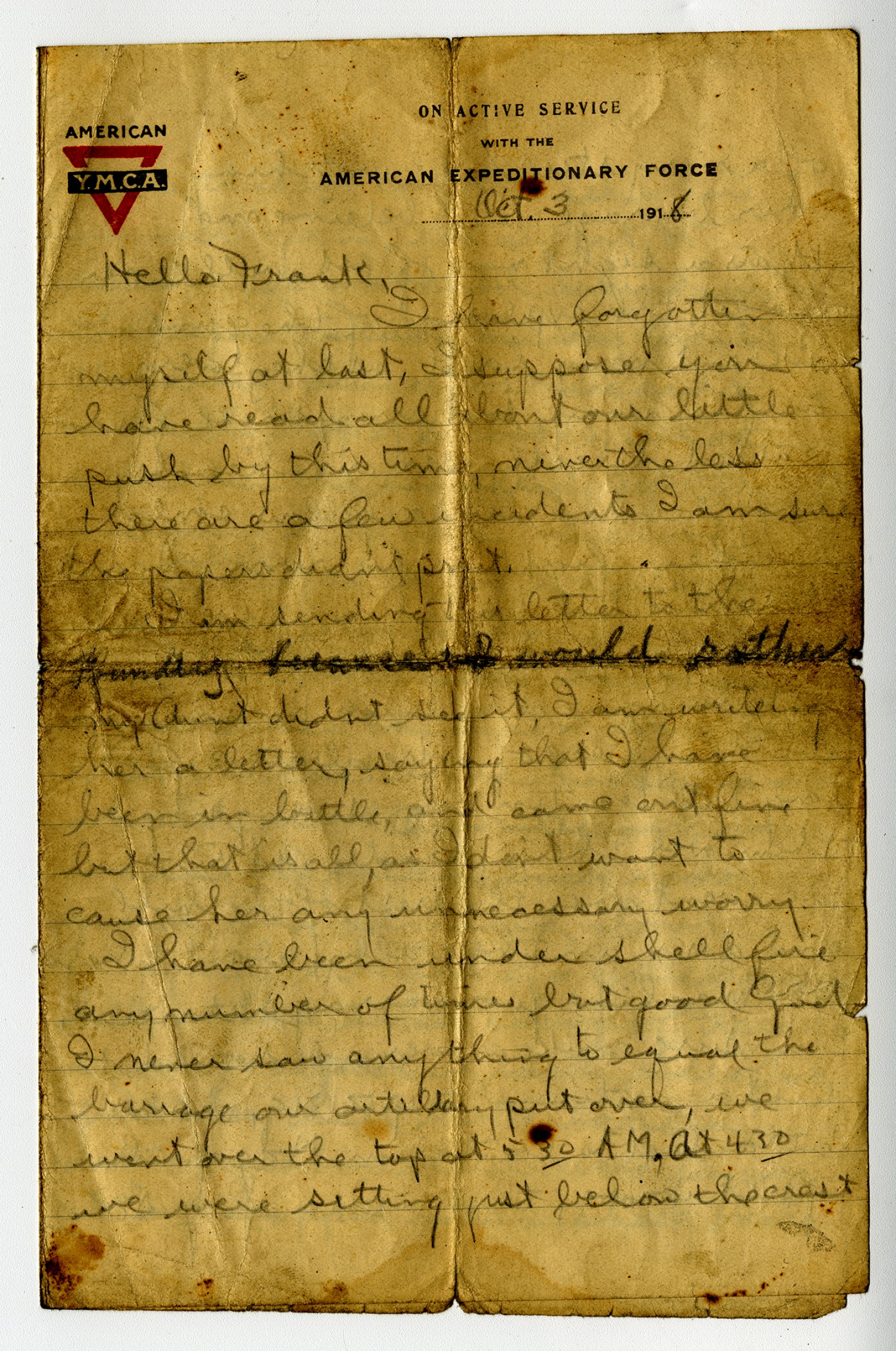 [October] 3 1918 Hello Frank, I have forgotten myself at last, I suppose you have read all about our little push by this time, never the less there are a few incidents I am sure the papers didn