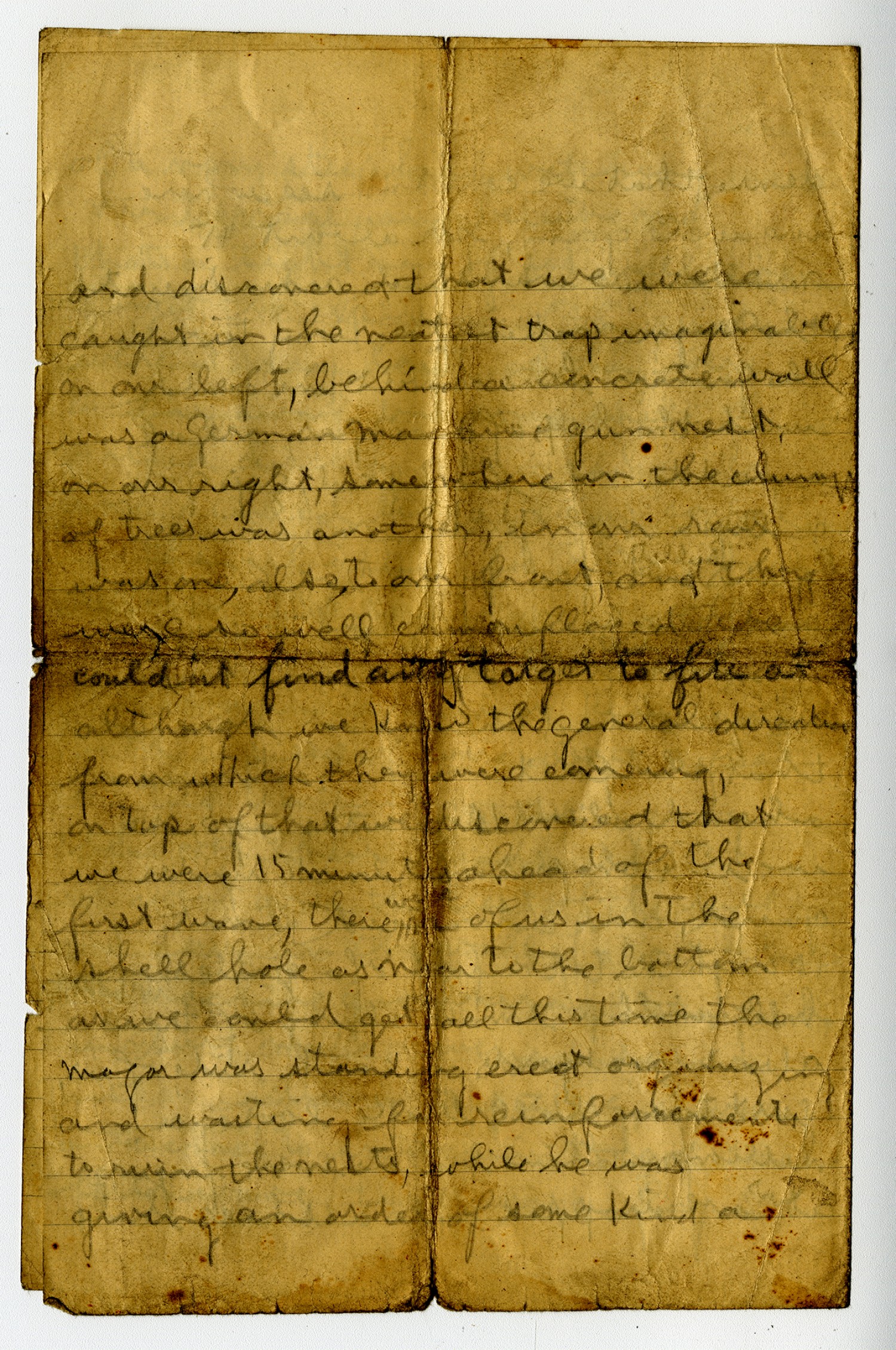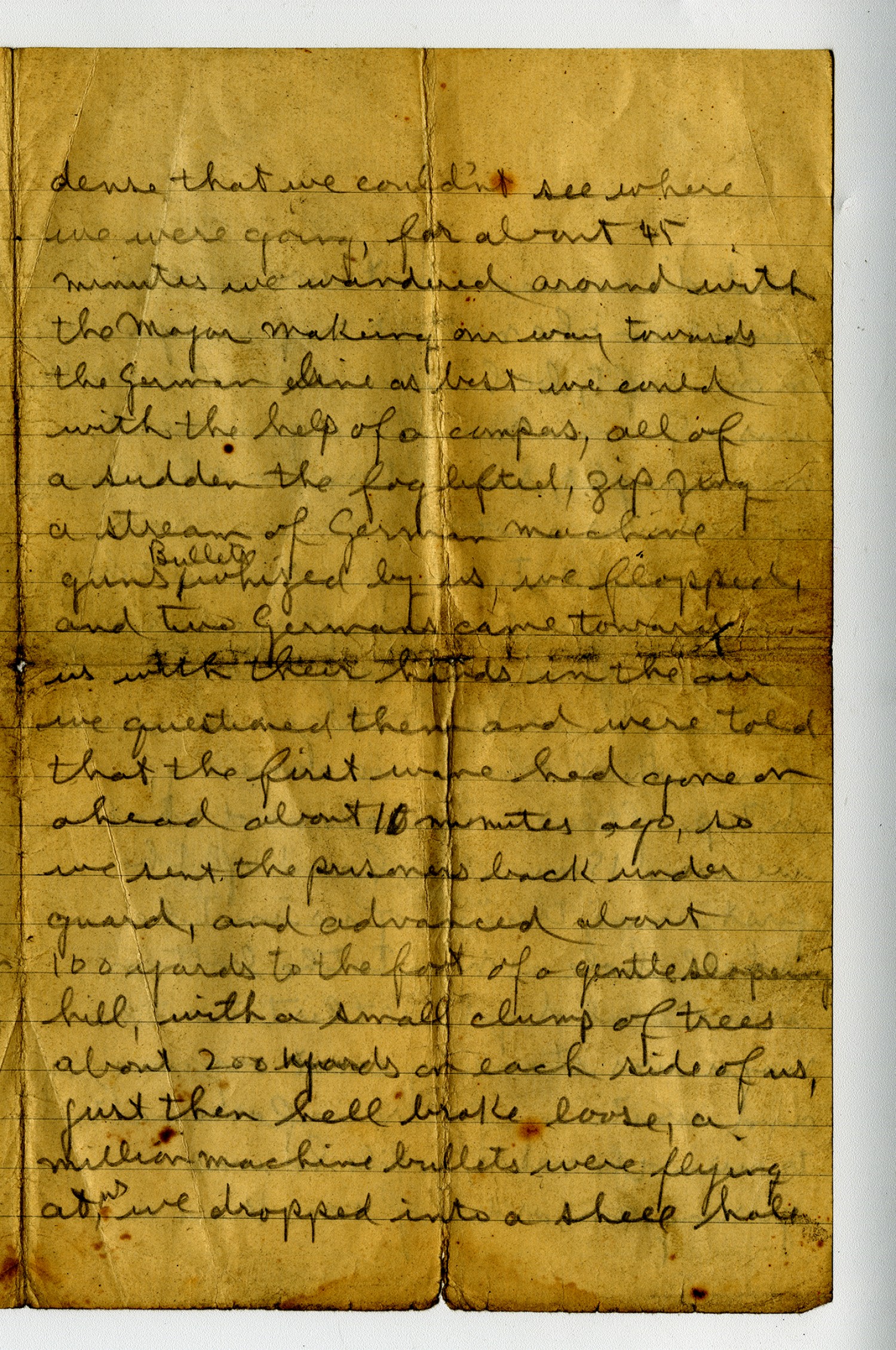 and discovered that we were caught in the neatest trap imaginable on our left, behind a concrete wall was a German machine gun nest, on our right, somewhere in the clumps of trees was another, in our rear was one, also, to our front, and they were so well camoflaged we could not find any target to fire at although we knew the general direction from which they were comeing, on top of that [m.s. illegible 1 wd] and that we were 15 minutes ahead of the first wave, there were [m.s. illegible 1 wd] of us in the shell hole as near to the bottom as we could get all this time the major was standing erect organizing and waiting for reinforcements to run the nest, while he was giving an order of some kind a