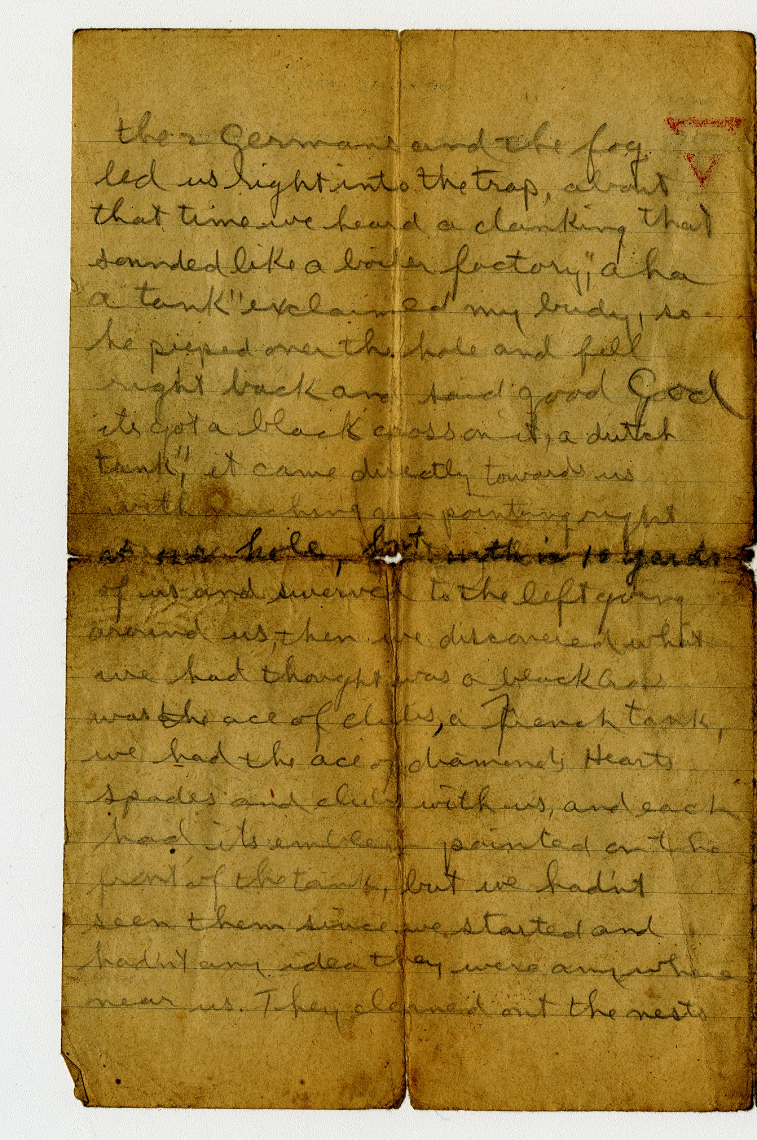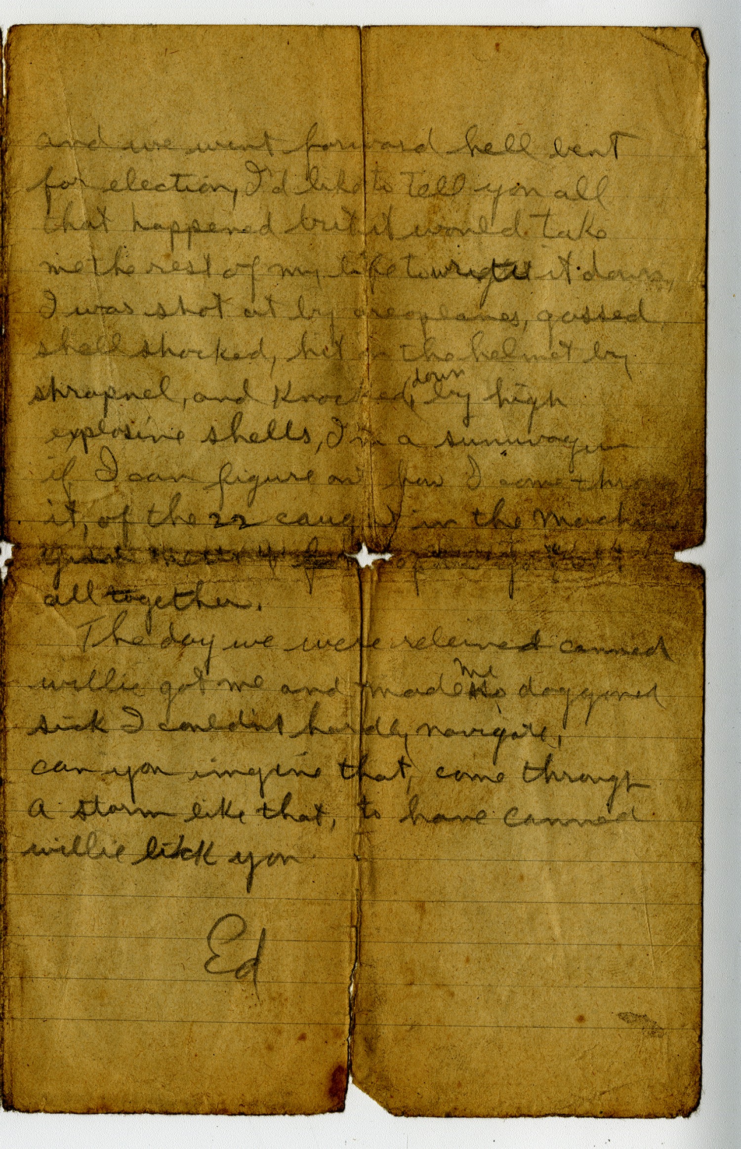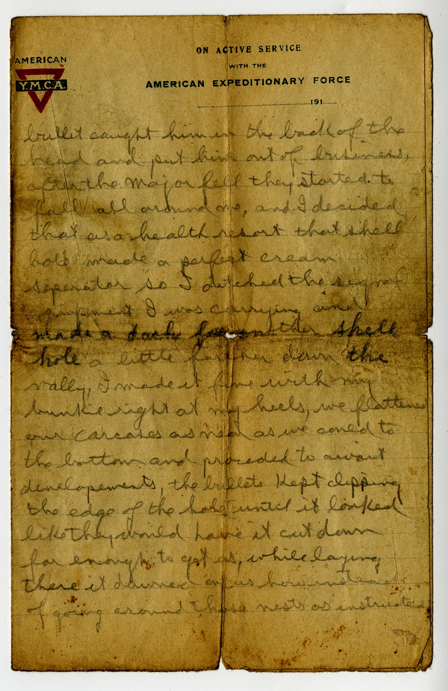 | Description | Private Edward W. Meier of St. Louis, Missouri, served with the 138th Infantry during World War One. Meier wrote his cousin-in-law Frank Baebler, also of Saint Louis, several humorous letters during the War. In this lette, Meier described his experience in battle and a German trap he escaped from in vivid detail. |