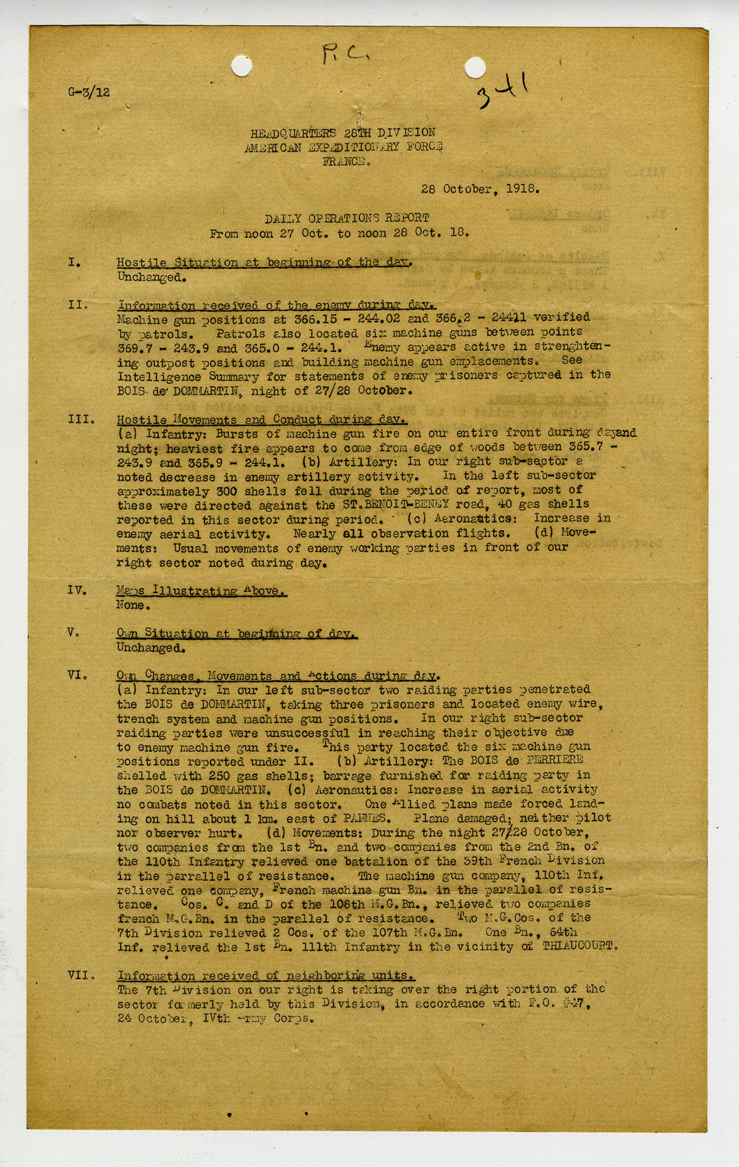 G-3/12 Headquarters 28th Division American Expeditionary Force France. 28 October, 1918. Daily Operations Report From noon 27 [October] to noon 28 [October 1918]. I. Hostile Situation at beginning of the day. Unchanged. II. Information received of the enemy during day. Machine gun positions at 366.15-244.02 and 366.2-24411 verified by patrols. Patrols also located six machine guns between points 369.7-243.9 and 365.0-244.1. Enemy appears active in strengthening outpost positions and building machine gun emplacements. See Intelligence Summary for statements of enemy prisoners captured in the Bois de Dommartin, night of 27/28 October. III. Hostile Movements and Conduct during day. (a) Infantry: Bursts of machine gun fire on our entire front during day and night; heaviest fire appears to come from edge of woods between 365.7-243.9 and 365.9-244.1 (b) Artillery: In our right sub-sector a noted decrease in enemy artillery activity. In the left sub-sector approximately 300 shells fell during the period of report, most of these were directed against the St. Benoit-Beney road, 40 gas shells reported in this sector during period. (c) Aeronautics: Increase in enemy aerial activity. Nearly all observation flights. (d) Movements: Usual movements of enemy working parties in front of our right sector noted during day. IV. Maps Illustrating Above. None. V. Own Situation at beginning of day. Unchanged. Own Changes, Movements and Actions during day. (a) Infantry: In our left sub-sector two raiding parties penetrated the Bois de Dommartin, taking three prisoners and located enemy wire, trench system and machine gun positions. In our right sub-sector raiding parties were unsuccessful in reaching their objective due to enemy machine gun fire. This party located the six machine gun positions reported under II. (b) Artillery: The Bois de Perriere shelled with 250 gas shells; barrage furnished for raiding party in the Bois de Dommartin. (c) Aeronautics: Increase in aerial activity no combats noted in this sector. One Allied plane made forced landing on hill about 1 km. east of Pannes. Plane damaged; neither pilot nor observer hurt. (d) Movements: During the night 27/28 October, two companies from the 1st Bn. and two companies from the 2nd Bn. of the110th Infantry relieved one battalion of the 39th French Division in the parrallel of resistance. The machine gun company, 110th Inf. relieved one company, French machine gun Bn. in the parallel of resistance. Cos. C. and D. of the 108th M.G. Bn., relieved two companies French M.G.Bn. in the parallel of resistance. Two MG.Cos. of the 7th Division relieved 2 Cos. of the 107th M.G.Bn. One Bn., 64th Inf. relieved the 1st Bn. 111th Infantry in the vicinity of Thiaucourt. VII. Information received of neighboring units. The 7th Division on our right is taking over the right portion of the sector formerly held by this Division, in accordance with F.O. #47, 24 October, IVth Army Corps.