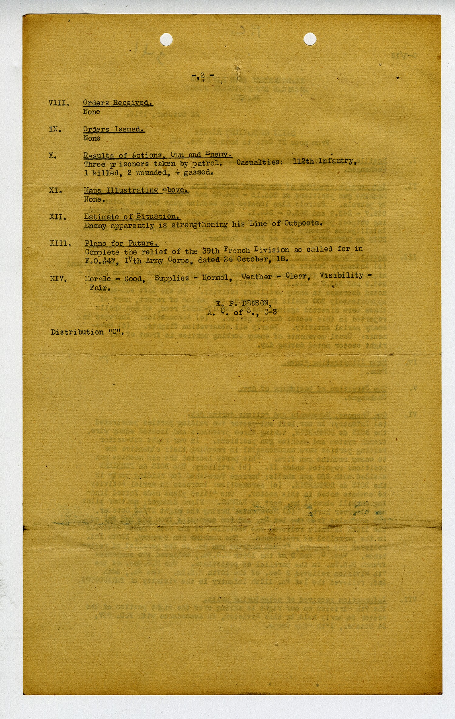 [page 2] VIII. Orders Received. None IX. Orders Issued. None X. Results of Actions, Own and Enemy. Three prisoners taken by patrol. Casualties: 112th Infantry, 1 killed, 2 wounded, 4 gassed. XI. Maps Illustrating Above. None. XII. Estimate of Situation. Enemy apparently is strengthening his Line of Outposts. XIII. Plans for Future. Complete the relief of the 39th French Division as called for in F.O. #47, IVth Army Corps, dated 24 October, [1918]. XIV. Morale-Good, Supplies-Normal, Weather- Clear, Visibility-Fair. E.P. Denson, A.C. of S., g-3 Distribution