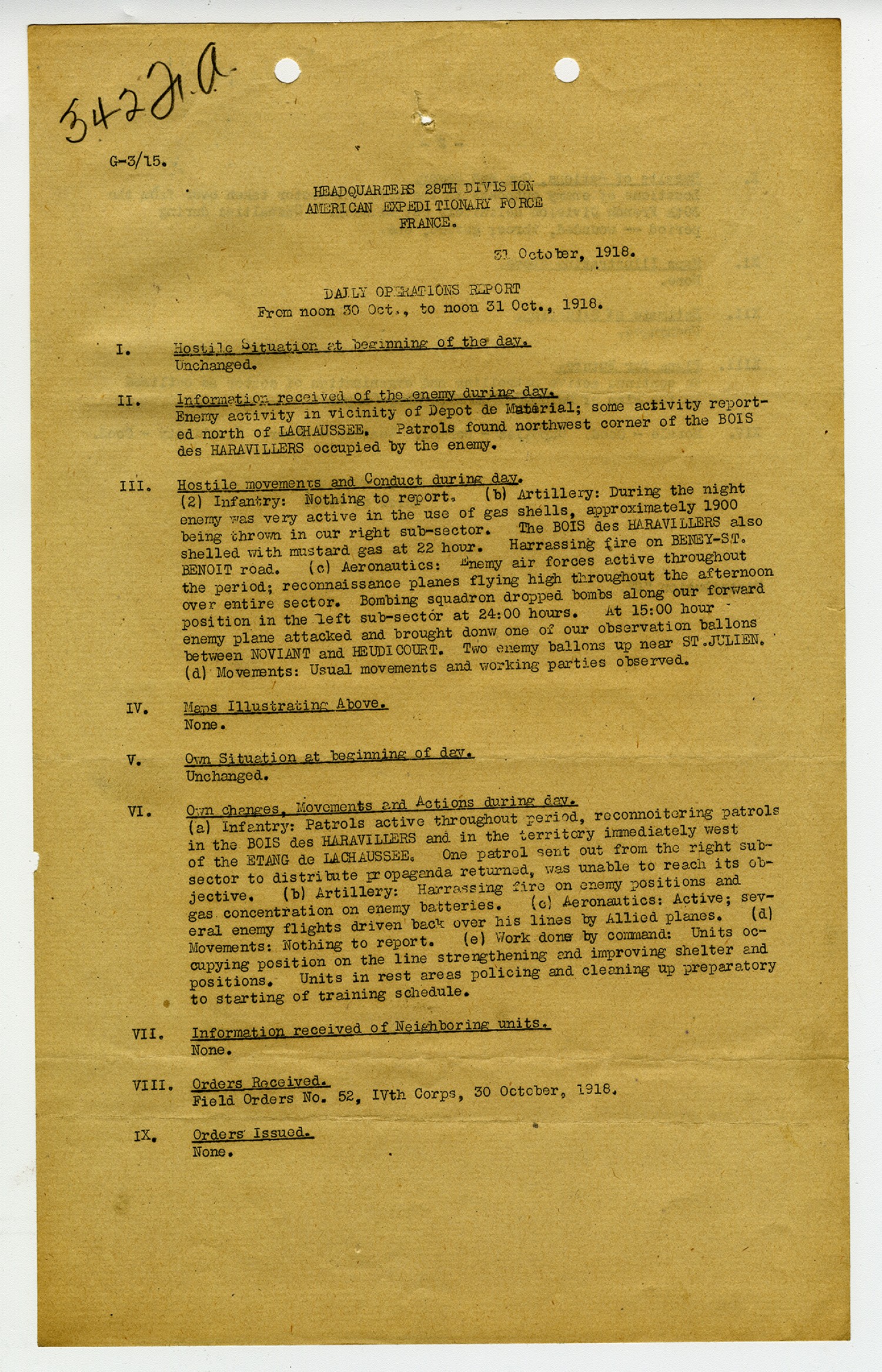 G-3/15. Headquarters 28th Division American Expeditionary Force France. 31 October, 1918. Daily Operations Report From noon 30 [October], to noon 31 [October], 1918. I. Hostile Situation at beginning of the day. Unchanged. II. Information received of the enemy during day. Enemy activity in vicinity of Depot de Material; some activity reported north of Lachaussee. Patrols found northwest corner of the Bois des Haravillers occupied by the enemy. III. Hostile movements and Conduct during day. (2) Infantry: Nothing to report. (b) Artillery: During the night enemy was very active in the use of gas shells, approximately 1900 being thrown in our right sub-sector. The Bois des Haravillers also shelled with mustard gas at 22 hour. Harrassing fire on Beney-St. Benoit road (c) Aeronautics: Enemy air forces active throughout the period; reconnaissance planes flying high throughout the afternoon over entire sector. Bombing squadron dropped bombs along our forward position in the left sub-sector at 24:00 hours. At 15:00 hour enemy plane attacked and brought donw one of our observation ballons between Novlant and Heudicourt. Two enemy ballons up near St. Julien. (d) Movements: Usual movements and working parties observed. IV. Maps Illustrating Above. None. V. Own Situation at beginning of day. Unchanged VI. Own changes, Movements, and Actions during day. (a) Infantry: Patrols active throughout period, reconnoitering patrols in the Bois des Haravillers and in the territory immediately west of the Etang de Lachaussee. One patrol sent out from the right sub-sector to distribute propaganda returned, was unable to reach its objective. (b) Artillery: Harrassing fire on enemy positions and gas concentration on enemy batteries. (c) Aeronautics: Active; several enemy flights driven back over his lines by Allied planes. (d) Movements: Nothing to report. (e) Work done by command: Units occupying position on the line strengthening and improving shelter and positions. Units in rest areas policing and cleaning up preparatory to starting of training schedule. VII. Information received of Neighboring units. None. VIII. Orders Received. Field Orders No. 52, IVth Corps, 30 October, 1918. IX. Orders Issued. None.