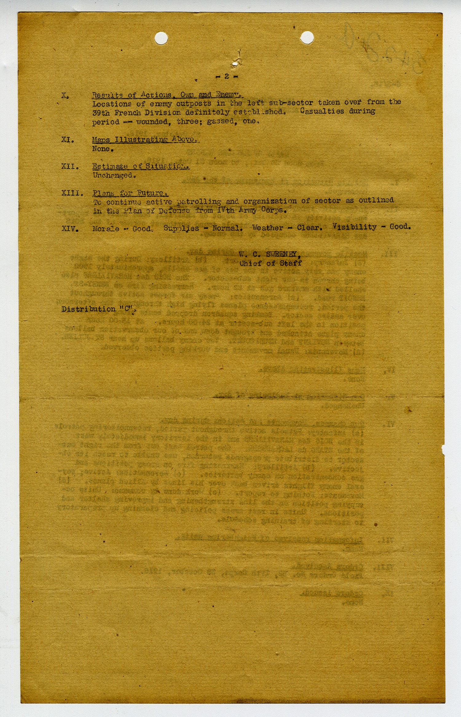 [page 2] X. Results of Actions, Own and Enemy. Locations of enemy outposts in the left sub-sector taken over from the 39th French Division definitely established. Casualties during period--wounded, three; gassed, one. XI. Maps Illustrating Above. None. XII. Estimate of Situation. Unchanged. XIII. Plans for Future. To continue active patrolling and organization of sector as outlined in the Plan of Defense from IVth Army Corps. XIV. Morale-Good. Supplies-Normal. Weather- Clear. Visibility- Good. W.C. Sweeney, Chief of Staff Distribution