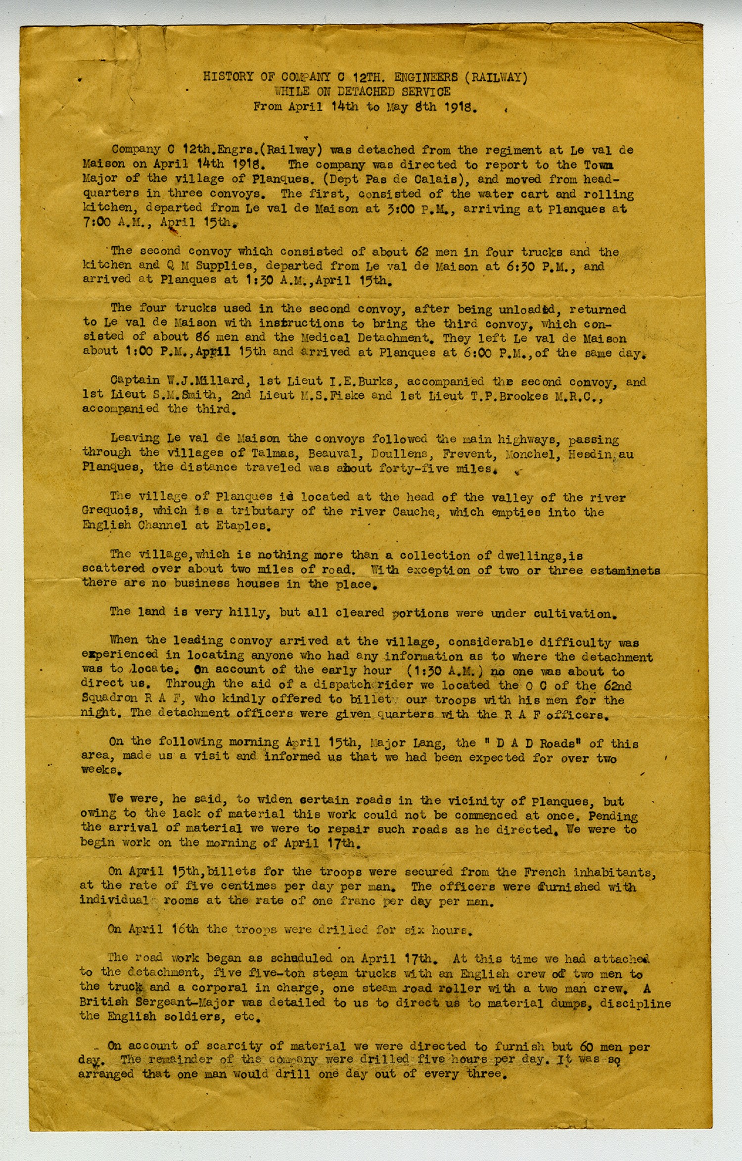 History of Company C 12th Engineers (Railway) While on Detached Service From April 14th to May 8th 1918. Company C 12th Engrs. (Railway) was a detached from the regiment at Le val de Maison on April 14th 1918. The company was directed to report to the Town Major of the village of Planques. (Dept Pas de Calais), and moved from headquarters in three convoys. The first, consisted of the water cart and rolling kitchen, departed from Le val de Maison at 3:00 P.M., arriving at Planques at 7:00 A.M., April 15th. The second convoy which consisted of about 62 men in four trucks and the kitchen and QM Supplies, departed from Le val de Maison at 6:30 P.M., and arrived at Panques at 1:30 A.M., April 15th. The four trucks used in the second convoy, after being unloaded, returned to Le val de Maison with instructions to bring the third convoy, which consisted of about 86 men and the Medical Detachment. They left Le val de Maison about 1:00 P.M., April 15th and arrived at Planques at 6:00 P.M., of the same day. Captain W.J. Millard, 1st Lieut I.E. Burks, accompanied the second convoy, and 1st Lieut S.M. Smith, 2nd Lieut M.S. Fiske and 1st Lieut T.P. Brookes M.R.C., accompanied the third. Leaving Le val de Maison the convoys followed the main highways, passing through the villages of Talmas, Beauval, Doullens, Frevent, Monchel, Hesdin au Planques, the distance traveled was about forty-five miles. The village of Planques is located at the head of the valley of the river Grequois, which is a tributary of the river Cauche, which empties into the English Channel at Etaples. The village, which is nothing more than a collection of dwellings, is scattered over about two miles of road. With exception of two or three estaminets there are no business houses in the place. The land is very hilly, but all cleared portions were under cultivation. When the leading convoy arrived at the village, considerable difficulty was experienced in locating anyone who had any information as to where the detachment was to locate. On account of the early hour (1:30 A.M.) no one was about to direct us. Through the aid of a dispatch rider we located the OC of the 62nd Squadron R A F, who kindly offered to billet our troops with his men for the night. The detachment officers were given quarters with the R A F officers. On the following morning April 15th, Major Lang, the