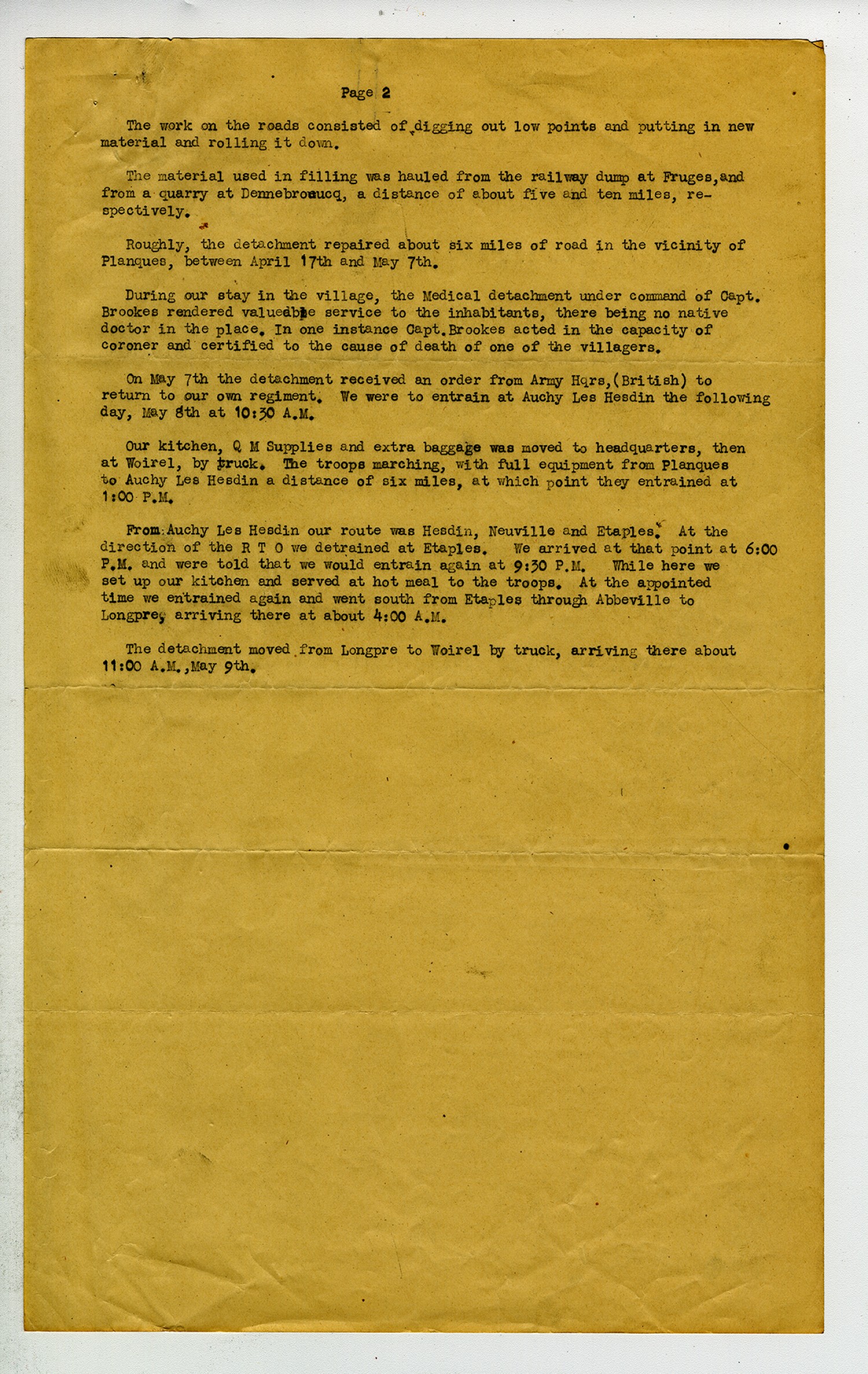 [Page 2] The work on the roads consisted of digging out low points and putting in new material and rolling it down. The material used in filling was hauled from the railway dump at Fruges, and from a quarry at Dennebroucq, a distance of about five and ten miles, respectively. Roughly, the detachment repaired about six miles of road in the vicinity of Planques, between April 17th and May 7th. During our stay in the village, the Medical detachment under command of Capt. Brookes rendered valuable service to the inhabitants, there being no native doctor in the place. In one instance Capt. Brookes acted in the capacity of coroner and certified to the cause of death of one of the villagers. On May 7th the detachment received an order from Army Hqrs, (British) to return to our own regiment. WE were to entrain at Auchy Les Hesdin the following day, May 8th at 10:30 A.M. Our kitchen, QM Supplies and extra baggage was moved to headquarters, then at Woirel, but truck. The troops marching, with full equipment from Planques to Auchy Les Hesdin a distance of six miles, at which point they entrained at 1:00 P.M. From Auchy Les Hesdin our route was Hesdin, Neuville and Etaples. At the direction of the RTO we detrained at Etaples. We arrived at that point at 6:00 P.M. and were told that we would entrain again at 9:30 P.M. While here we set up our kitchen and served at hot meal to the troops. At the appointed time we entrained again and went south from Etaples through Abbeville to Longpre, arriving there at about 4:00 A.M. The detachment moved from Longpre to Woirel by truck, arriving there about 11:00 A.M., May 9th.