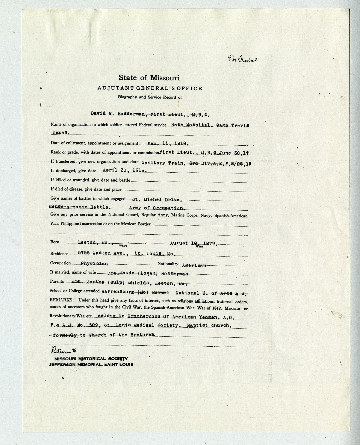 | Source | Bosserman, David G. "History of My War Experiece." 03 August 1918 - 11 November 1918. World War I Collection. A1771. Missouri History Museum, St. Louis, Missouri. |