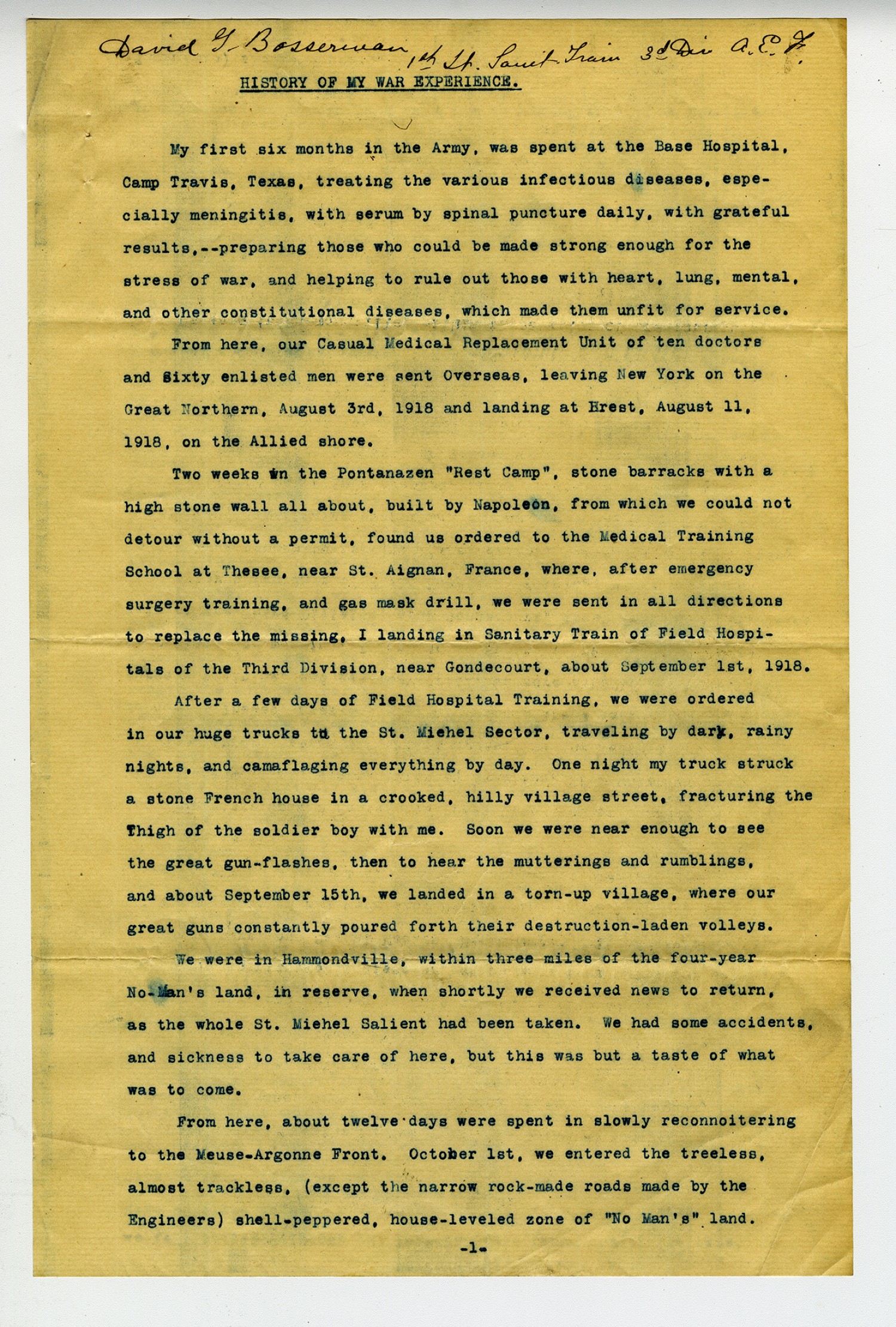 [page 1] David G. Bosserman 1st Lt. Saint Train 3d Div A.E.F. History of my War Experience. My first six months in the Army, was spent at the Base Hospital, Camp Travis, Texas, treating the various infectious diseases, especially meningitis, with serum by spinal puncture daily, with grateful results,--preparing those who could be made strong enough for the stress of war, and helping to rule out those with heart, lung, mental, and other constitutional diseases, which made them unfit for service. From here, our Casual Medical Replacement Unit of ten doctors and Sixty enlisted men were sent Overseas, leaving New York on the Great Northern, August 3rd, 1918 and landing at Hrest, August 11, 1918, on the Allied shore. Two weeks in the Pontanazen