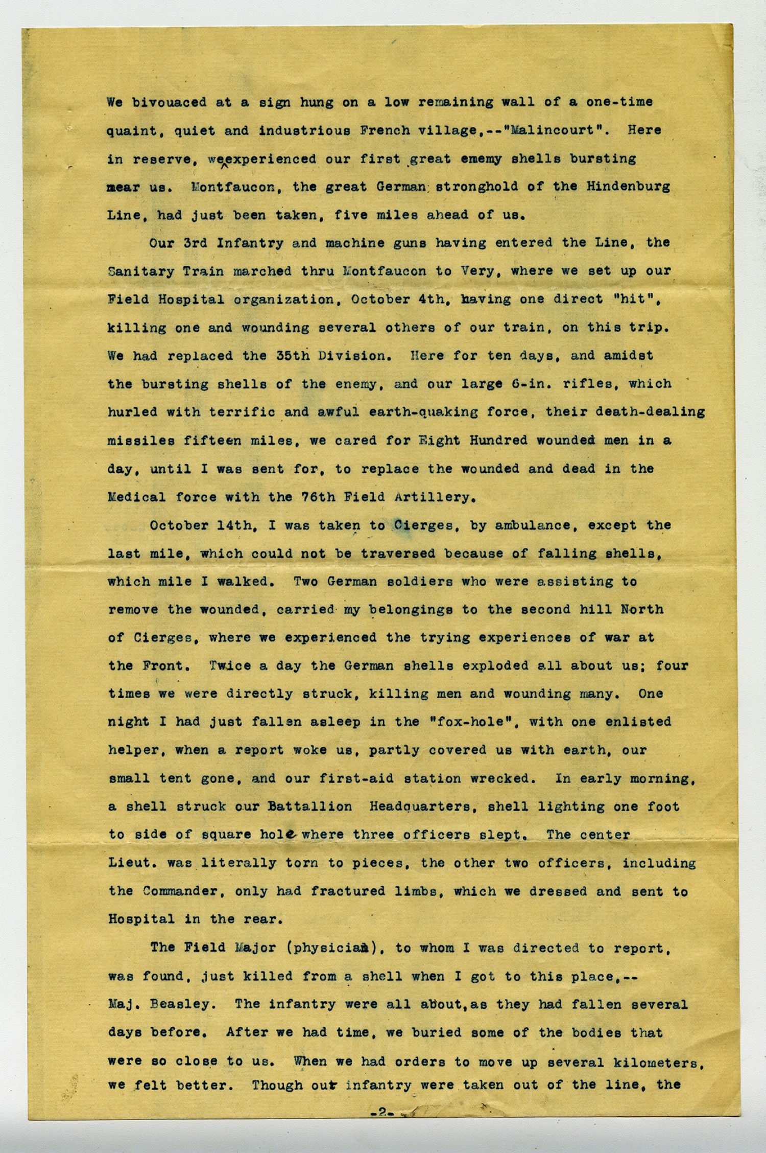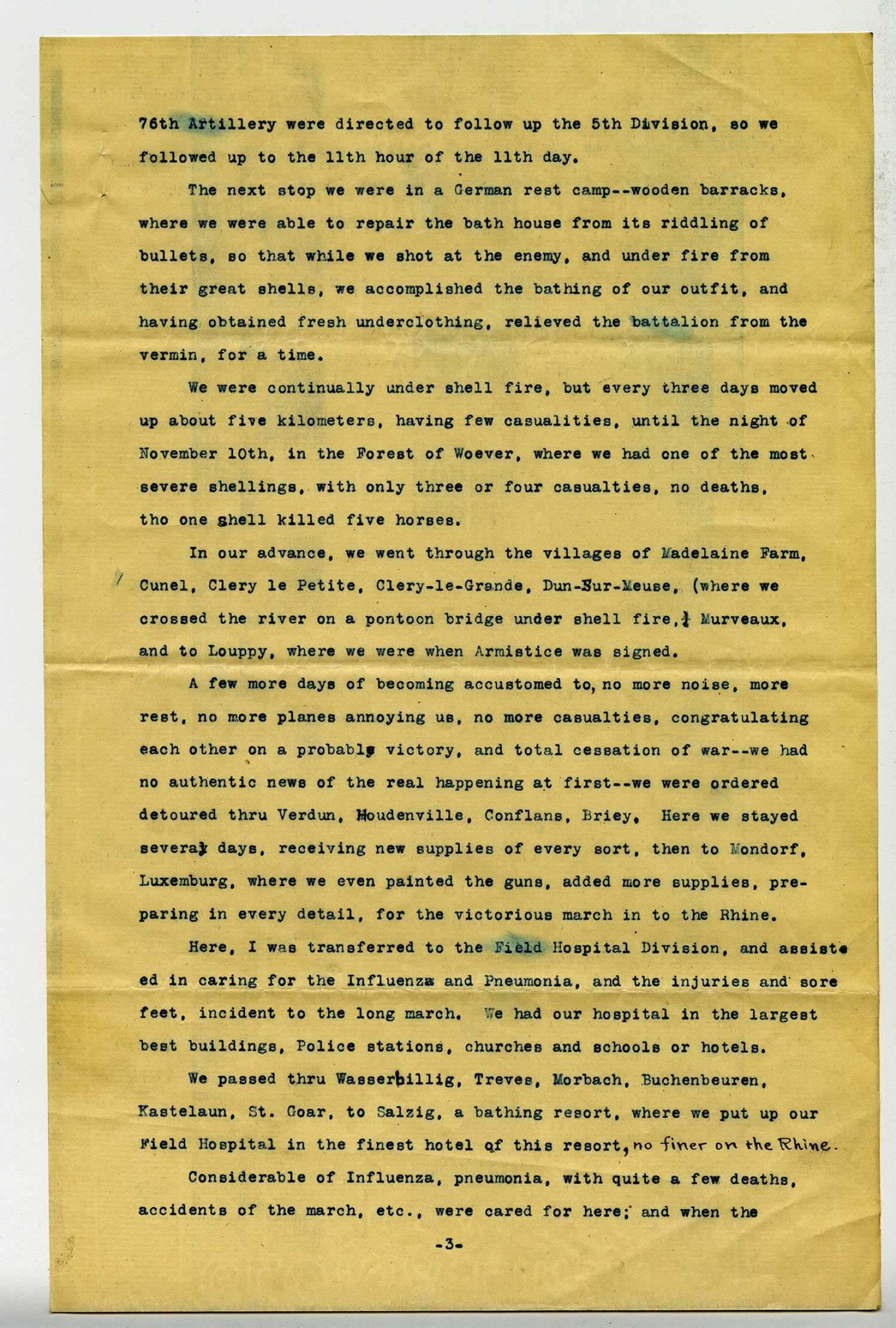 [page 3] 76th Artillery were directed to follow up the 5th Division, so we followed up to the 11th hour of the 11th day. The next stop we were in a German rest camp--wooden barracks, where we were able to repair the bath house from its riddling of bullets, so that while we shot at the enemy, and under fire from their great shells, we accomplished the bathing of our outfit, and having obtained fresh underclothing, relieved the battalion from the vermin, for a time. We were continually under shell fire, but every three days moved up about five kilometers, having few casualities, until the night of November 10th, in the Forest of Woever, where we had one of the most severe shellings, with only three or four casualties, no deaths, tho one shell killed five horses. In our advance, we went through the villages of Madelaine Farm, Cunel, Clery le Petite, Clery-le Grande, Dun-Sur-Meuse, (where we crossed the river on a pontoon bridge under shell fire, Murveaux, and to Louppy, where we were when Armistice was signed. A few more days of becoming accustomed to, no more noise, more rest, no more planes annoying us, no more casualties, congratulating each other on a probable victory, and total cessation of war--we had no authentic news of the real happening at first--we were ordered detoured thru Verdun, Moudenville, Conflans, Briey. Here we stayed several days, receiving new supplies of every sort, then to Mondorf, Luxemburg, where we even painted the guns, added more supplies, preparing in every detail, for the victorious march in to the Rhine. Here, I was transferred to the Field Hospital Division, and assisted in caring for the Influenza and Pneumonia, and the injuries and sore feet, incident to the long march. We had our hospital in the largest best buildings, Police stations, churches and schools or hotels. We passed thru Wasserbillig, Treves, Morbach, Buchenbeuren, Kastelaun, St. Goar, to Salzig, a bathing resort, where we put up our Field Hospital in the finest hotel of this resort, no finer on the Rhine. Considerable of Influenza, pneumonia, with quite a few deaths, accidents of the march, etc., were cared for here; and when the