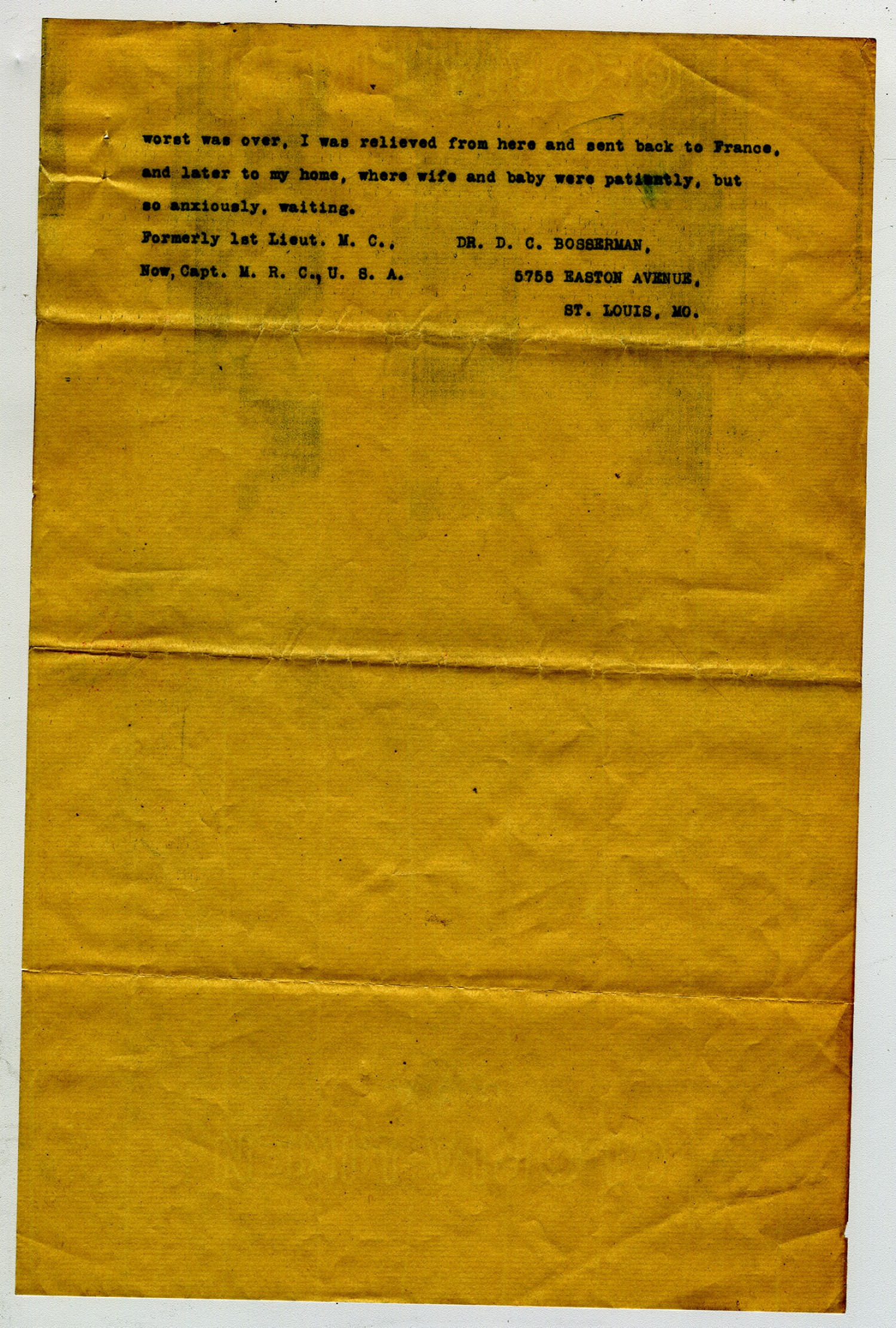 worst was over, I was relieved from here and sent back to France, and later to my home, where wife and baby were patiently, but so anxiously, waiting. Formerly 1st Lieut. M.C., Now, Capt. M.R.C., U.S.A. Dr. D.C. Bosserman, 5755 Easton Avenue, St. Louis, MO.