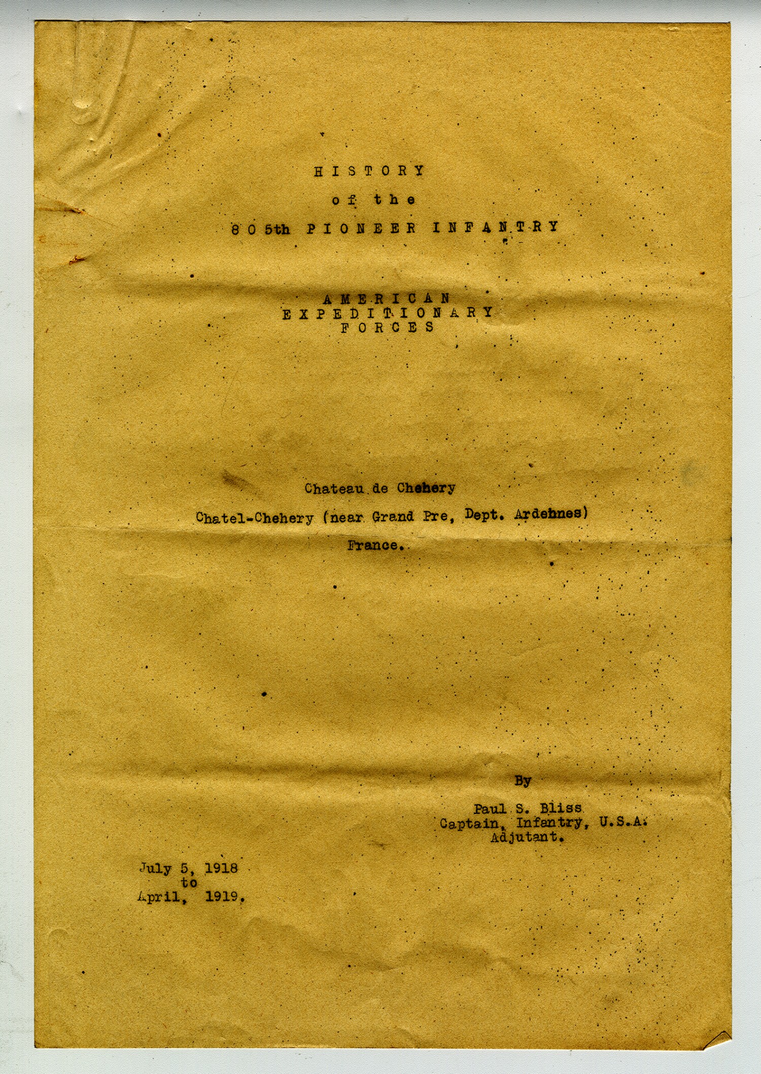 American Expeditionary Forces Chateau de Chehery Chatel-Chehery (near Grand Pre, Dept. Ardehnes) France. By Paul S. Bliss Captain, Infantry, U.S.A. Adjutant. July 5, 1918 to April, 1919.