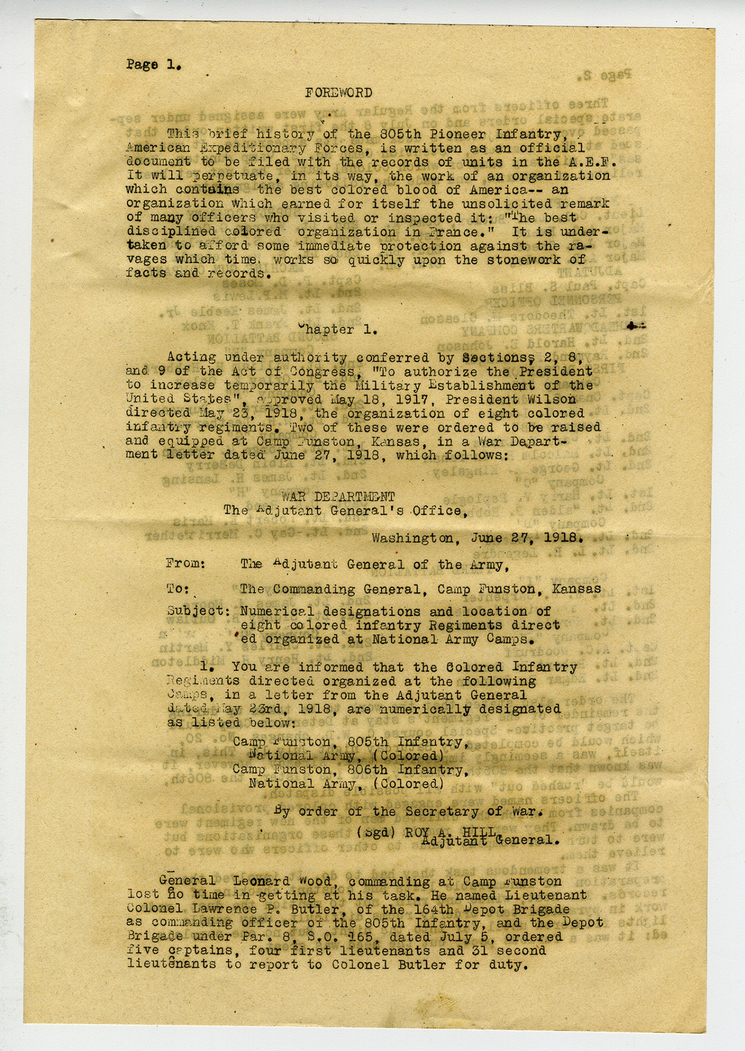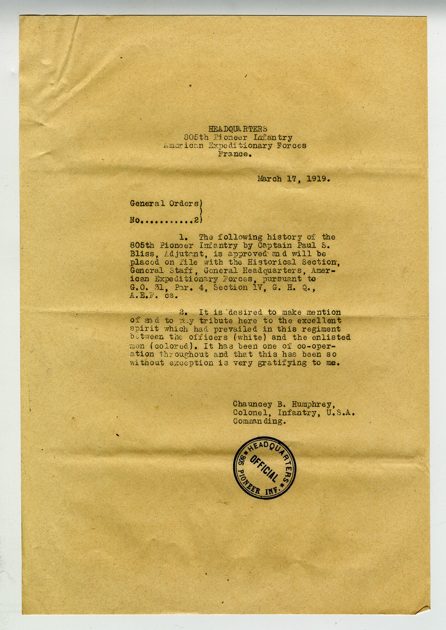 Headquarters 805th Pioneer Infantry American Expeditionary Forces France. March 17, 1919. General Orders No 2 1. The following history of the 805th Pioneer Infantry by Captain Paul S. Bliss, Adjutant, is approved and will be placed on file with the Historical Section, General Staff, General Headquarters, American Expeditionary Forces, pursuant to G.O. 31, Par. 4, Section IV, G.H.Q., A.E.F. cs. 2. It is desired to make mention of and to pay tribute here to the excellent spirit which had prevailed in this regiment between the officers (white) and the enlisted men (colored). It has been one of co-operation throughout and that this has been so without exception is very gratifying to me. Chauncey B. Humphrey, Colonel Infantry, U.S.A. Commanding.