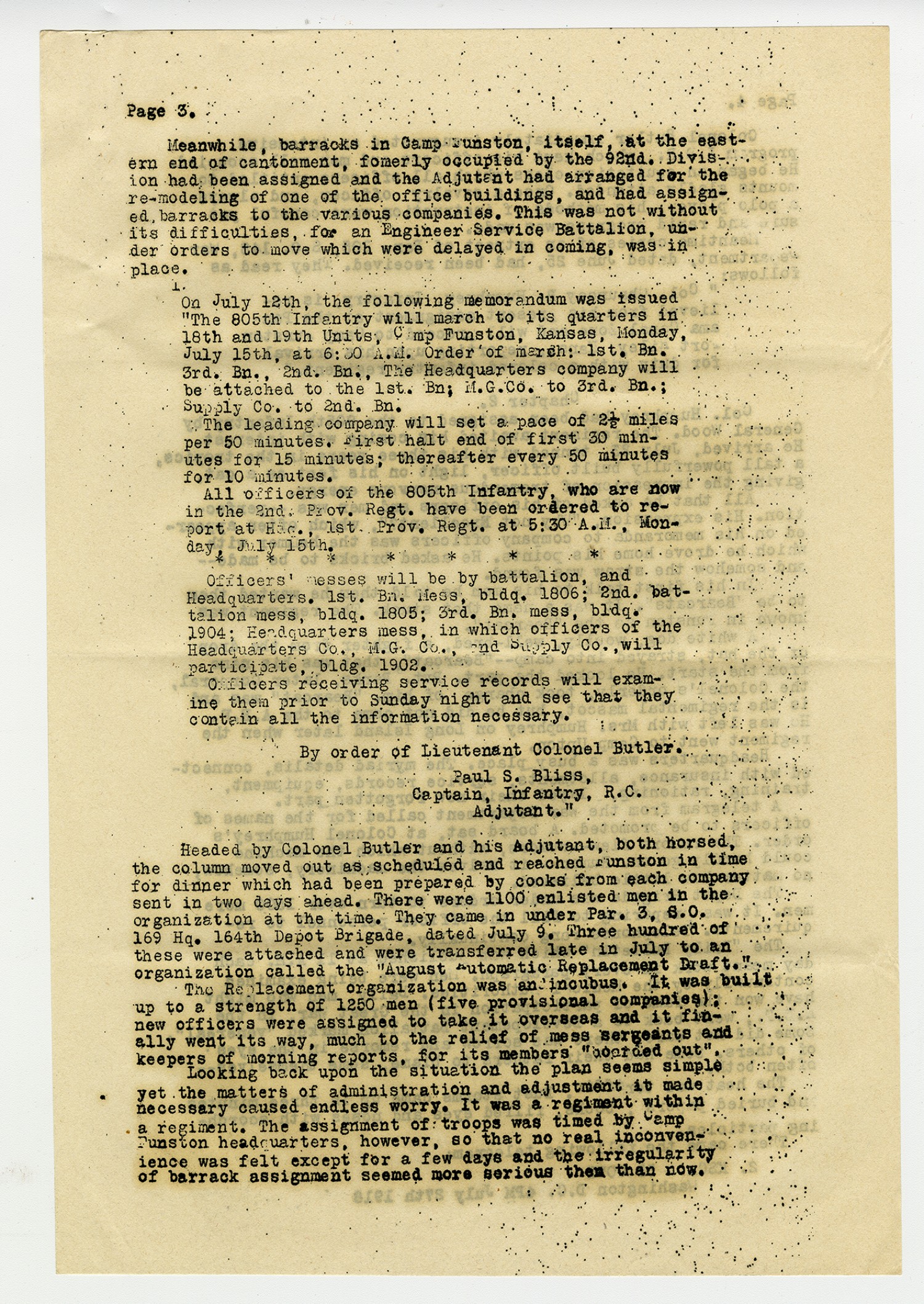 [Page 3] Meanwhile, barracks in Camp Funston, itself, at the eastern end of cantonment, formerly occupied by the 92nd. Division had been assigned and the Adjutant had arranged for the re-modeling of one of the office buildings, and had assigned barracks to the various companies. This was not without its difficulties, for and Engineer Service Battalion, under orders to move which were delayed in coming, was in place. 1. On July 12th, the following memorandum was issued