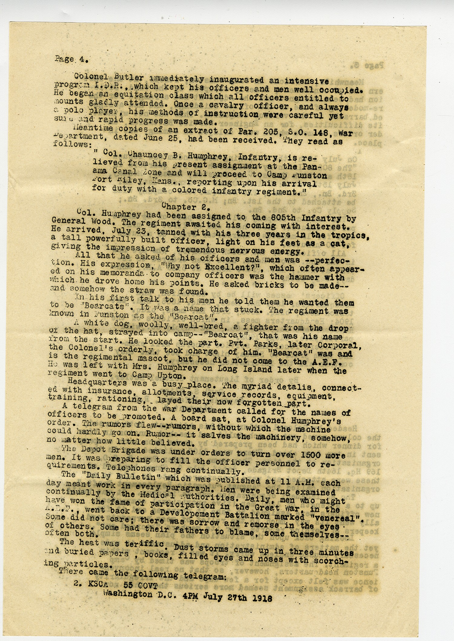 [Page 4] Colonel Butler immediately inaugurated an intensive program I.D.R., Which kept his officers and men well occupied. He began an equitation class which all officers entitled to mounts gladly attended. Once a cavalry officer, and always a polo player, his methods of instruction were careful yet sure and rapid progress was made. Meantime copies of an extract of Par. 205, S.O. 148, War Department, dated June 25, had been received. They read as follows: