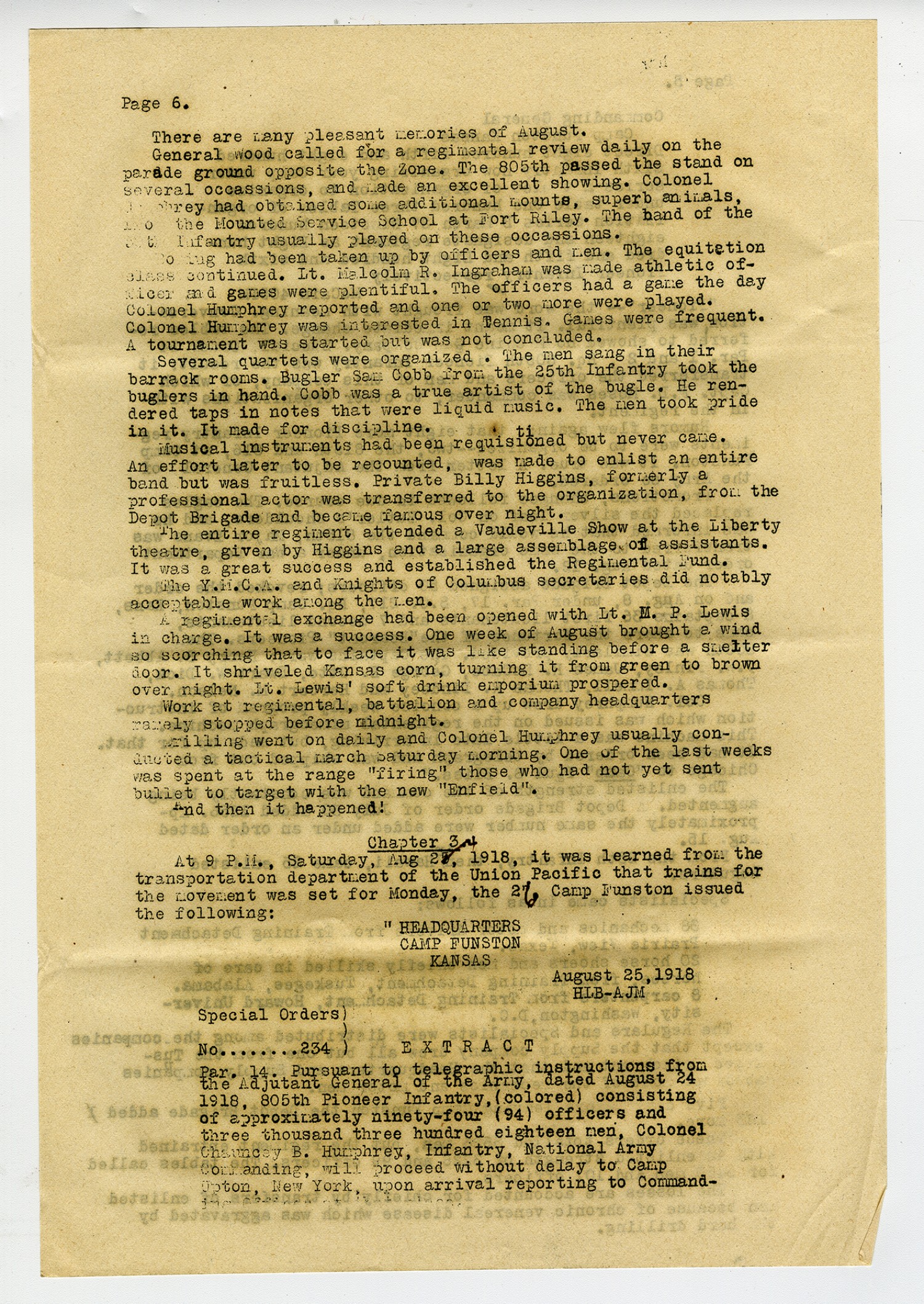 [Page 6] There are many pleasant memories of August. General Wood called for a regimental review daily on the parade ground opposite the Zone. The 805th passed the stand on several occasions, and made an excellent showing. Colonel [m.s. illegible: 1 wd] had obtained some additional mounts, superb animals, [m.s. illegible: 1 wd] the Mounted Service School at Fort Riley. The band of the [m.s. illegible: 1 wd] Infantry usually played on these occasions. [m.s. illegible: 1 wd] had been taken up by officers and men. The equitation class continued. Lt. Malcolm R. Ingraham was made athletic officer and games were plentiful. The officers had a game the day Colonel Humphrey reported and one or two more were played. Colonel Humphrey was interested in Tennis. Games were frequent. A tournament was started but was not concluded. Several quartets were organized. The men sang in their barrack rooms. Bugler Sam Cobb from the 25th Infantry took the buglers in hand. Cobb was a true artist of the bugle. He rendered taps in notes that were liquid music. The men took pride in it. It made for discipline. Musical instruments had been requisitioned but never came. An effort later to be recounted, was made to enlist an entire band but was fruitless. Private Billy Higgins, formerly a professional actor was transferred to the organization, from the Depot Brigade and became famous over night. The entire regiment attended a Vaudeville Show at the Liberty theatre, given by Higgins and a large assemblage of assistant. It was a great success and established the Regimental Fund. The Y.M.C.A. and Knights of Columbus secretaries did notably acceptable work among the men. A regimental exchange had been opened with Lt. M.P. Lewis in charge. It was a success. One week of August brought a wind so scorching that to face it was like standing before a smelter door. It shriveled Kansas corn, turning it from green to brown over night. Lt. Lewis