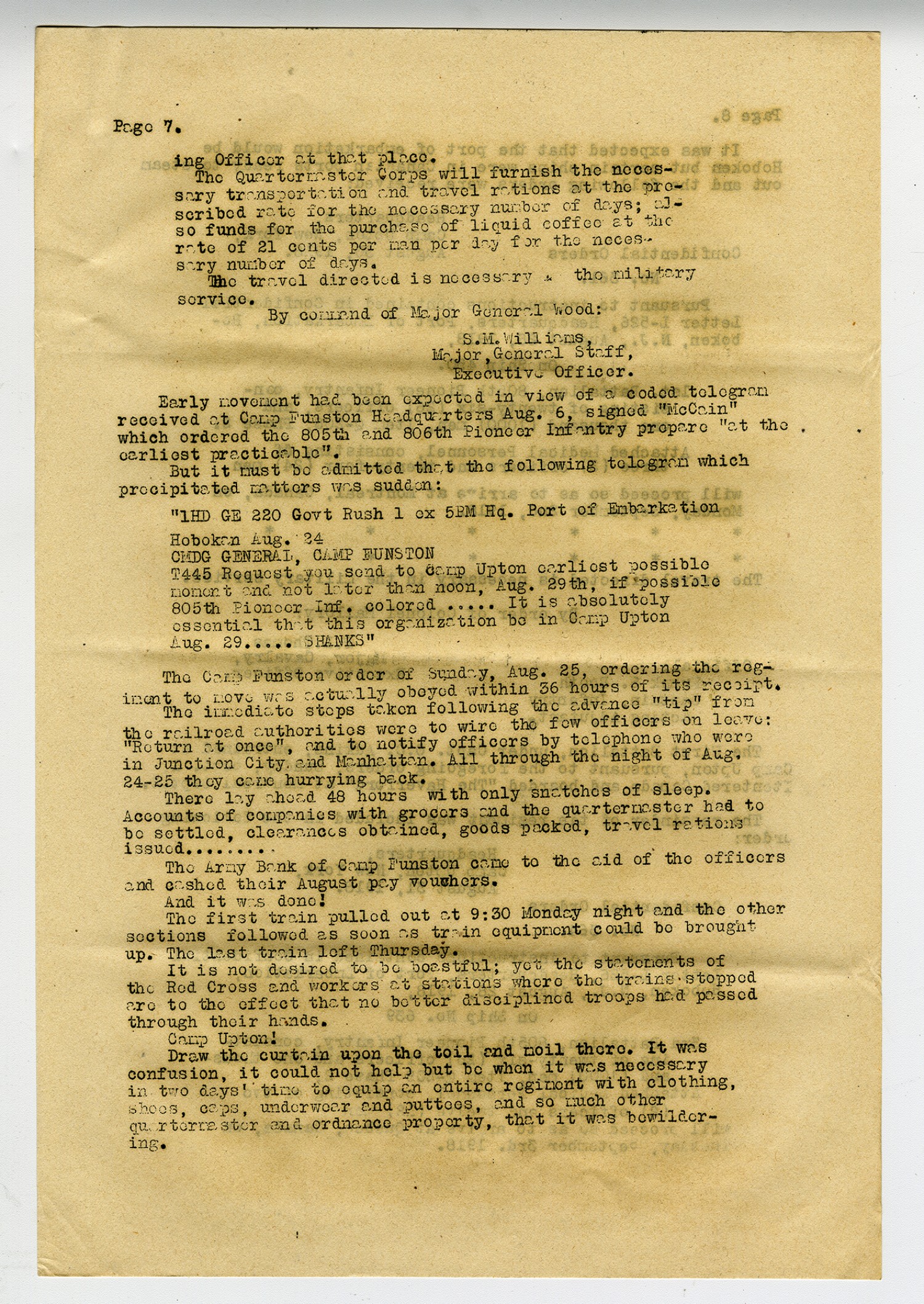 [Page 7] ing Officer at that place. The Quartermaster Corps will furnish the necessary transportation and travel rations at the prescribed rate for the necessary number of days; also funds for the purchase of liquid coffee at the rate of 21 cents per man per day for the necessary number of days. The travel directed is necessary the military service. By command of Major General Woo: S.M. Williams, Major, General Staff, Executive Officer. Early movement had been expected in view of a coded telegram received at Camp Funston Headquarters [August] 6, signed