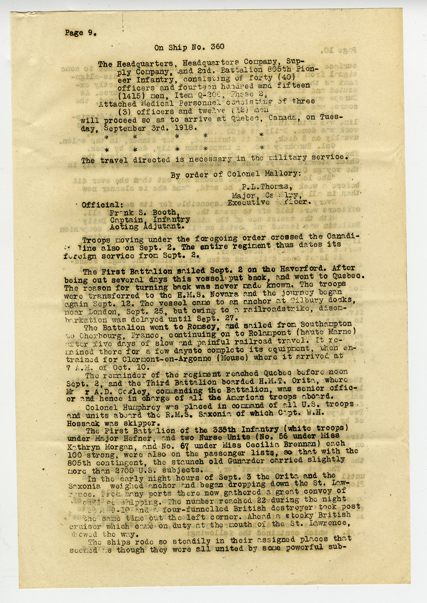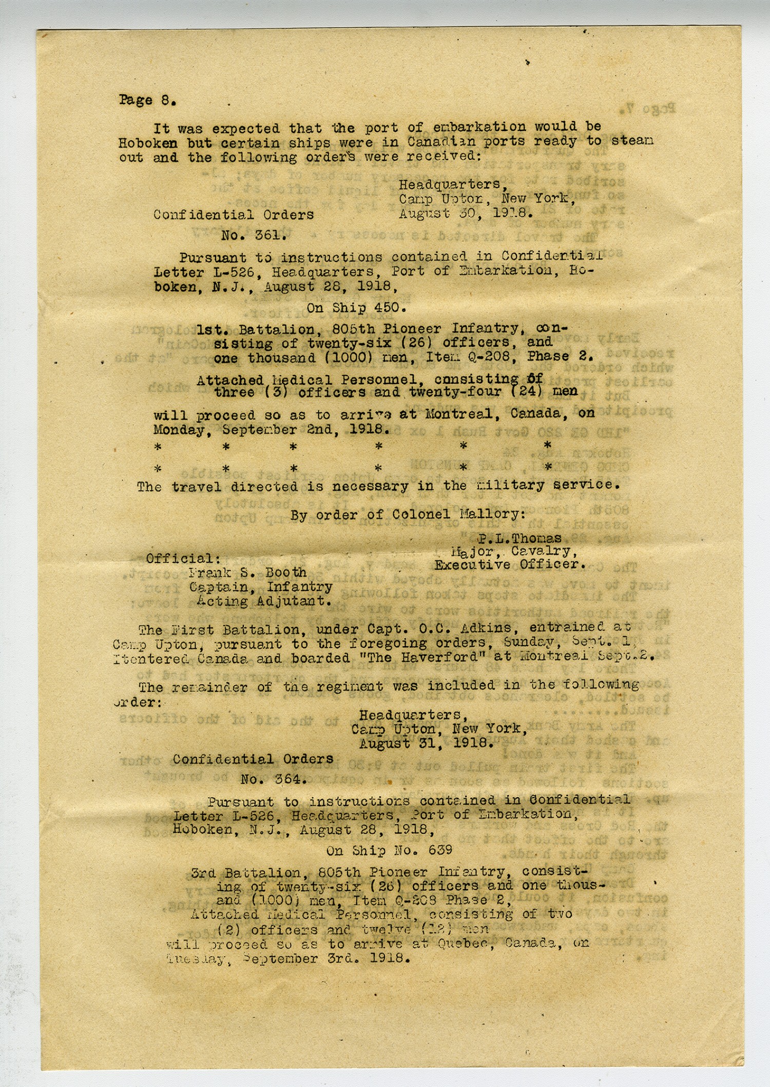 [Page 8] It was expected that the port of embarkation would be Hoboken but certain ships were in Canadian ports ready to steam out and the following orders were received: Headquarters, Camp Upton, New York, August 30, 1918. Confidential Orders No. 361 Pursuant to instructions contained in Confidential Letter L-526, Headquarters, Port of Embarkation, Hoboken, [New Jersey], August 28, 1918, On Ship 450. 1st. Battalion, 805th Pioneer Infantry, consisting of twenty-six (26) officers, and one thousand (1000) men, Item Q-208, Phase 2. Attached Medical Personnel, consisting of three (3) officers and twenty-four (24) men will proceed so as to arrive at Montreal, Canada, on Monday, September 2nd, 1918. The travel directed is necessary in the military service. By order of Colonel Mallory: P.L. Thomas Major, Cavalry, Executive Officer. Official: Frank S. Booth Captain, Infantry Acting Adjutant. The First Battalion, under Capt. O.C. Adkins, entrained at Camp Upton, pursuant to the foregoing orders, Sunday, [September] 1, Itentered Canada and boarded
