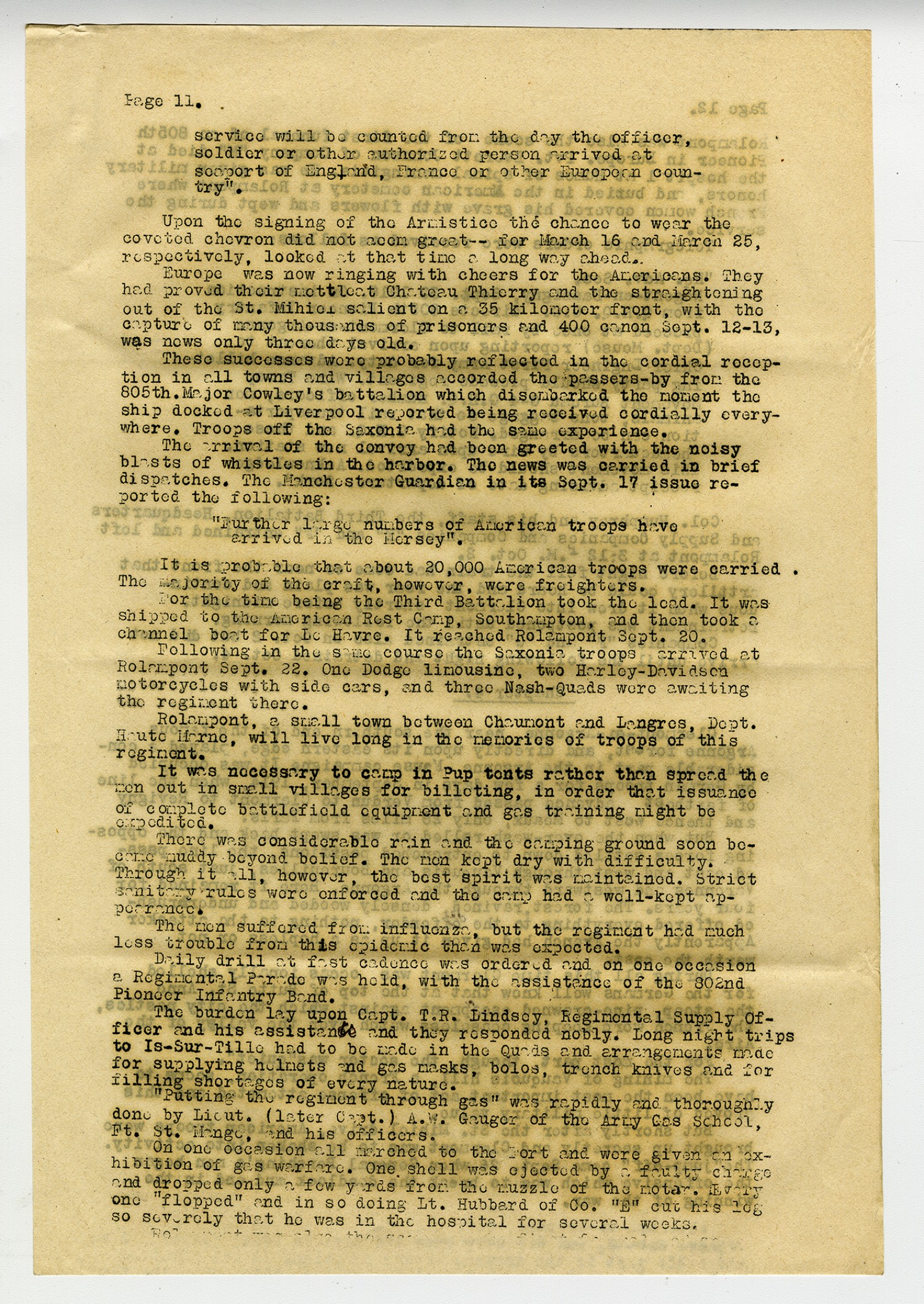 | Source | Bliss, Paul S. History of the 805th Pioneer Infantry. 05 July 1918 - April 1919. World War I Collection. A1771. Missouri History Museum, St. Louis, Missouri. |