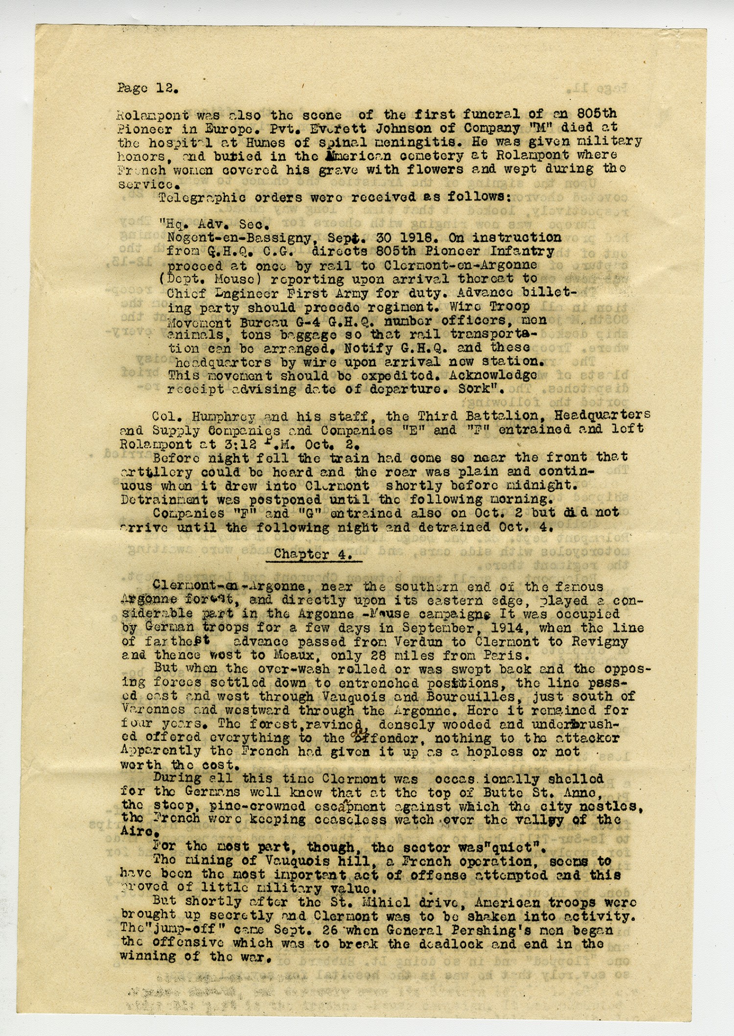 [Page 12] Rolampont was also the scene of the first funeral of an 805th Pioneer in Europe. Pvt. Everett Johnson of Company