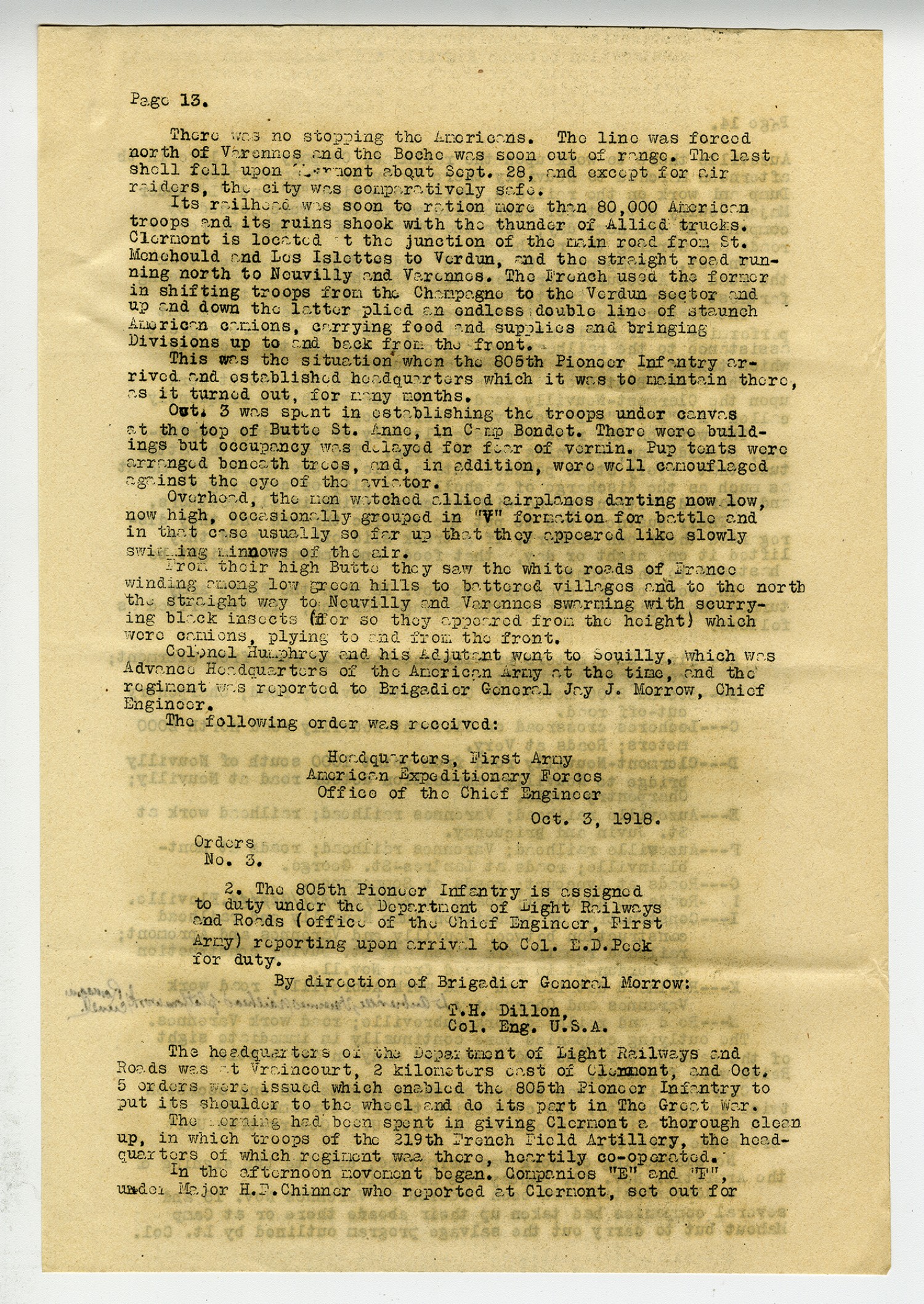 [Page 13] There was no stopping the Americans. The line was forced north of Varennes and the Boche was soon out of range. The last shell fell upon Chermont about [September] 28, and except for air raiders, the city was comparatively safe. Its railhead was soon to ration more than 80,000 American troops and its ruins shook with the thunder of Allied trucks. Clermont is located at the junction of the main road from St. Menehould and Lost Islettes to Verdun, and the straight road running north to Neuvilly and Varennes. The French used the former in shifting troops from the Champagne to the Verdun sector and up and down the latter plied and endless double line of staunch American camions, carrying food and supplies and bringing Divisions up to and back from the front. This was the situation when the 805th Pioneer Infantry arrived and established headquarters which it was to maintain there, as it turned out, for many months. [October] 3 was spent in establishing the troops under canvas at the top of Butte St. Anne, in Camp Bondet. There was buildings but occupancy was delayed for fear of Vermin. Pup tents were arranged beneath traces, and, in addition, were well camouflaged against the eye of the aviator. Overhead, the men watched allied airplanes darting now low, now high, occasionally grouped in