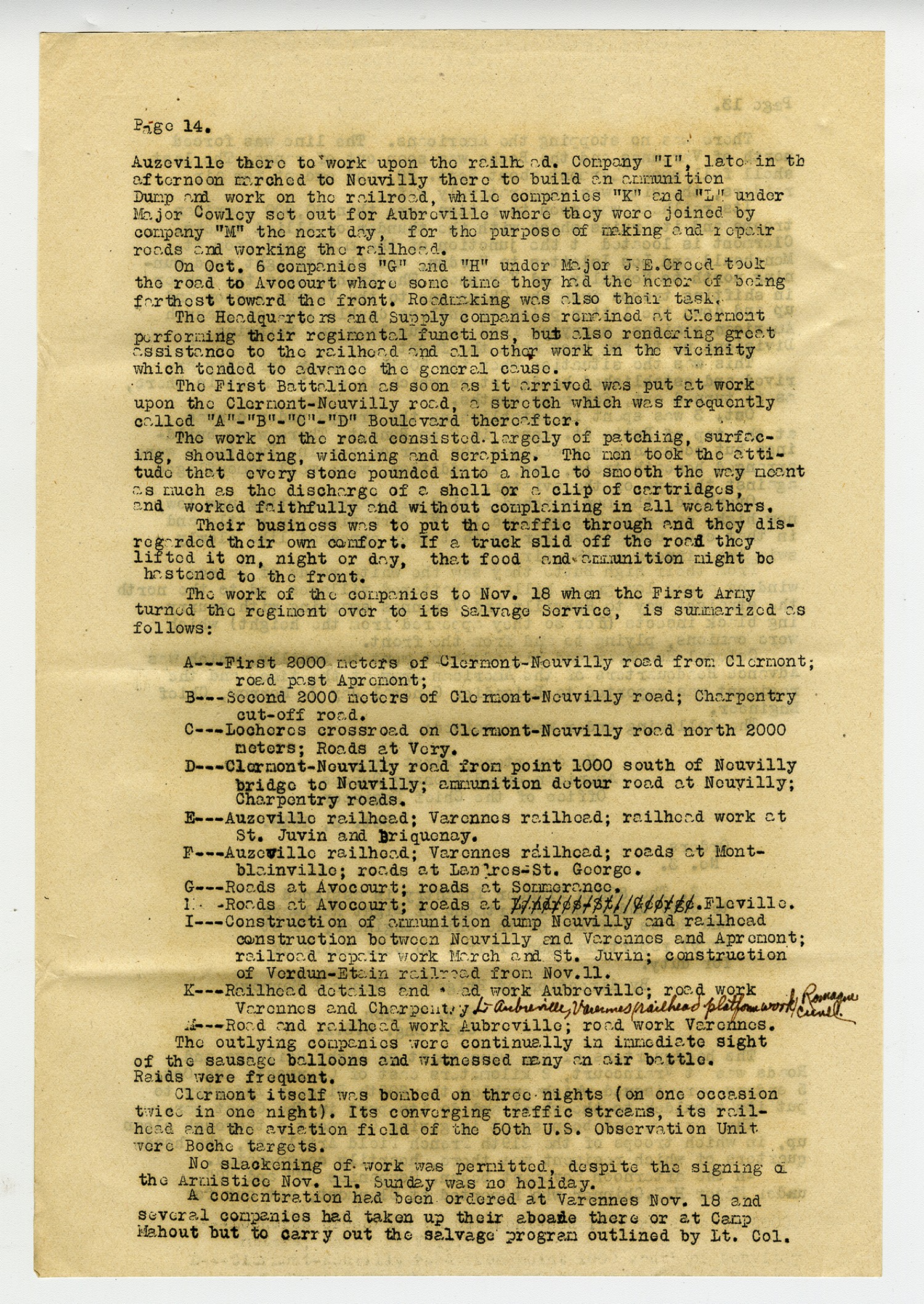 [Page 14] Auzeville there to work upon the railhead. Company