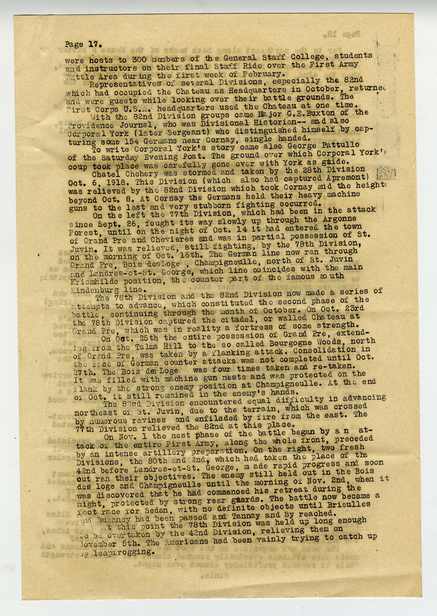 [Page 17] were hosts to 300 members of the General Staff College, students and instructors on their final Staff Ride over the First Army Battle Area during the first week of February. Representatives of several Divisions, especially the 82nd which had occupied the Chateau as Headquarters in October, returned and were gusts while looking over their battle grounds. The First Corps U.S.A. headquarters used the Chateau at one time. With the 82nd Division groups came Major G.E. Buxton of the Providence Journal, who was Divisional Historian--and also Corporal York (later Sergeant) who distinguished himself by capturing some 154 Germans near Cornay, single handed. To write Corporal York