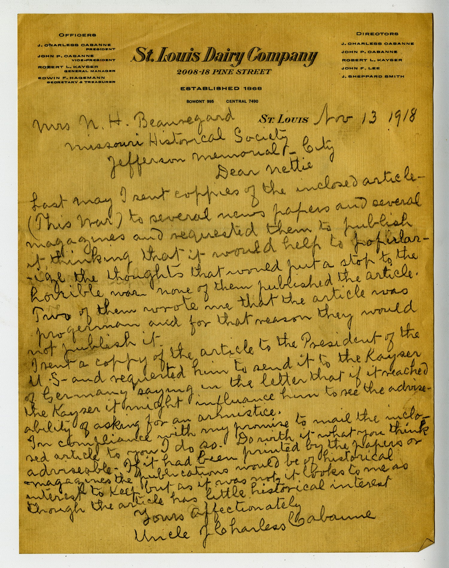 Mrs N.H. Beauregard [November] 13 1918 Missouri Historical Society Jefferson Memorial _City Dear Nettie Last May I sent coppies of the inclosed article-(This War) to several news papers and several magazines and requested them to publish it, thinking that it would help to popularize the thoughts that would put a stop to the horrible war. none of them published the article. Two of them wrote me that the article was pro german and for that reason they would not publish it. I sent a coppy of the article to the President of the U.S. and requested him to send it to the Kayser of Germany saying in the letter that if it reached the Kayser it might influence him to see the adviseability of asking for an armistice. In compliance with my promise to mail the inclosed article to you I do so. Do with it what you think adviseable. If it had been printed by the papers or magazines the publications would be of historical interest to keep but as it was not it looks to me as though the article has little historical interest Yours affectionately Uncle J Charles Cabanne