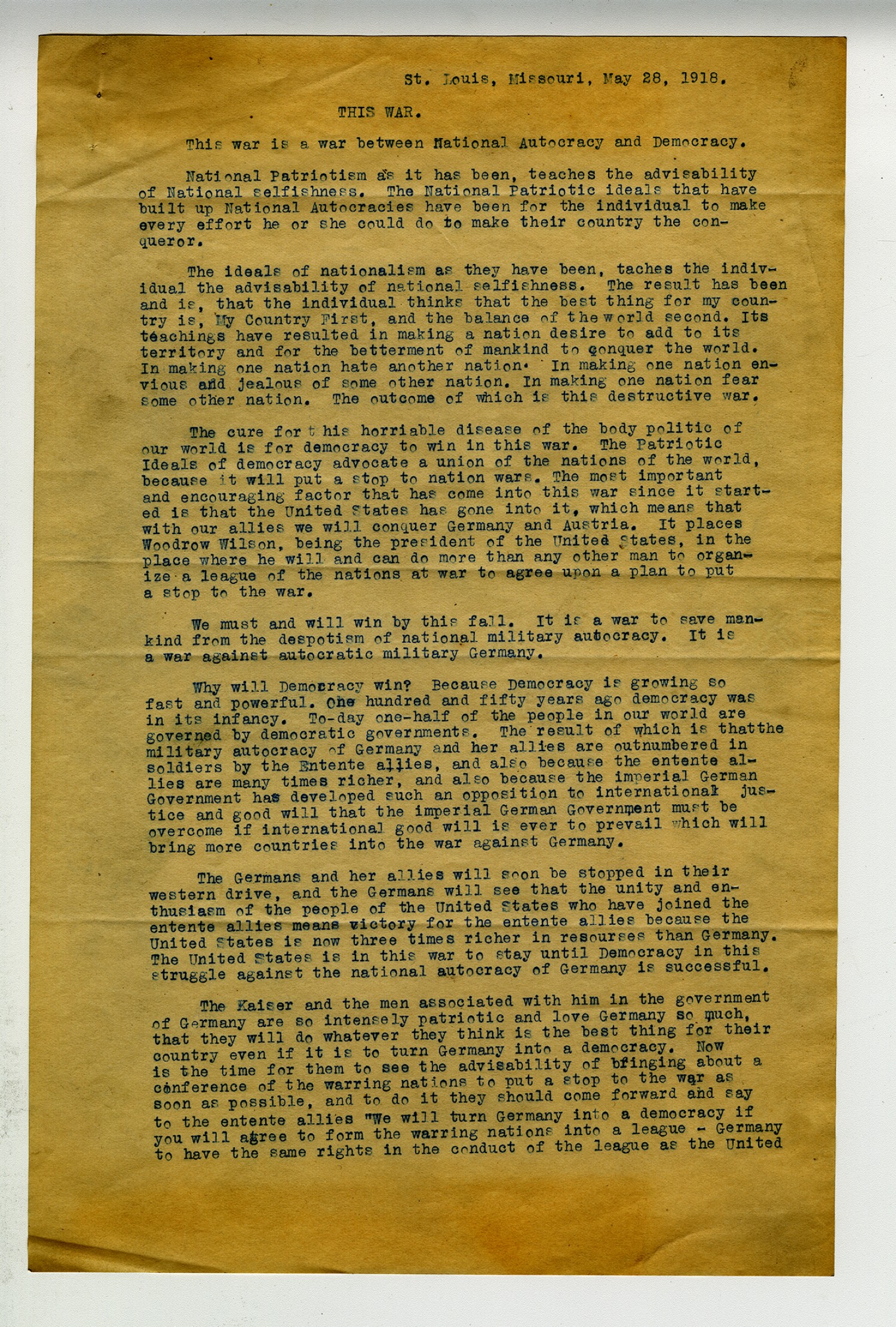 St. Louis, Missouri, May 28, 1918. This War. This war is a war between National Autocracy and Democracy. National Patriotism as it has been, teaches the advisability of the National selfishness. The National Patriotic ideals that have built up National Autocracies have been for the individual to make every effort he or she could do to make their country the conqueror. The ideals of nationalism as they have been, taches the individual the advisability of national selfishness. The result has been and is, that the individual thinks that the best thing for my country is, My Country First, and the balance of the world second. Its teachings have resulted in making a nation desire to add to its territory and for the betterment of mankind to conquer the world. In making one nation hate another nation. In making one nation envious and jealous of some other nation. In making one nation fear some other nation. The outcome of which is this destructive war. The cure for this horriable disease of the body politic of our world is for democracy to win in this war. The Patriotic Ideals of democracy advocate a union of the nations of the world, because it will put a stop to nation wars. The most important and encouraging factor that has come into this war since it started is that the United States has gone into it, which means that with our allies we will conquer Germany and Austria. It places Woodrow Wilson, being the president of the United States, in the place where he will and can do more than any other man to organize a league of the nations at war to agree upon a plan to put a stop to the war. We must and will win by this fall. It is a war to save mankind from the despotism of national military autocracy. IT is a war against autocratic military Germany. Why will Democracy? Because Democracy is growing so fast and powerful. One hundred and fifty years ago democracy was in its infancy. To-day and half of the people in our world are governed by democratic governments. The result of which is that the military autocracy of Germany and her allies are outnumbered in soldiers by the Entente allies, and also because the entente allies are many times richer, and also because the imperial German Government has developed such an opposition to international justice and good will that the imperial German Government must be overcome if international good will is ever to prevail which will bring more countries into the war against Germany. The Germans and her allies will soon be stopped in their western drive, and the Germans will see that the unity and enthusiasm of the people of the United States who have joined the entente allies means victory for the entente allies because the United States is now three times richer in resourses than Germany. The United States is in this war to stay until Democracy in this struggle against the national autocracy of Germany is successful. The Kaiser and the men associated with him in the government of Germany are so intensely patriotic and love Germany so much, that they will do whatever they think is the best thing for their country even if it is to turn Germany into a democracy. Now is the time for them to see the advisability of bringing about a conference of the warring nations to put a stop to the war as soon as possible, and to do it they should come forward and say to the entente allies