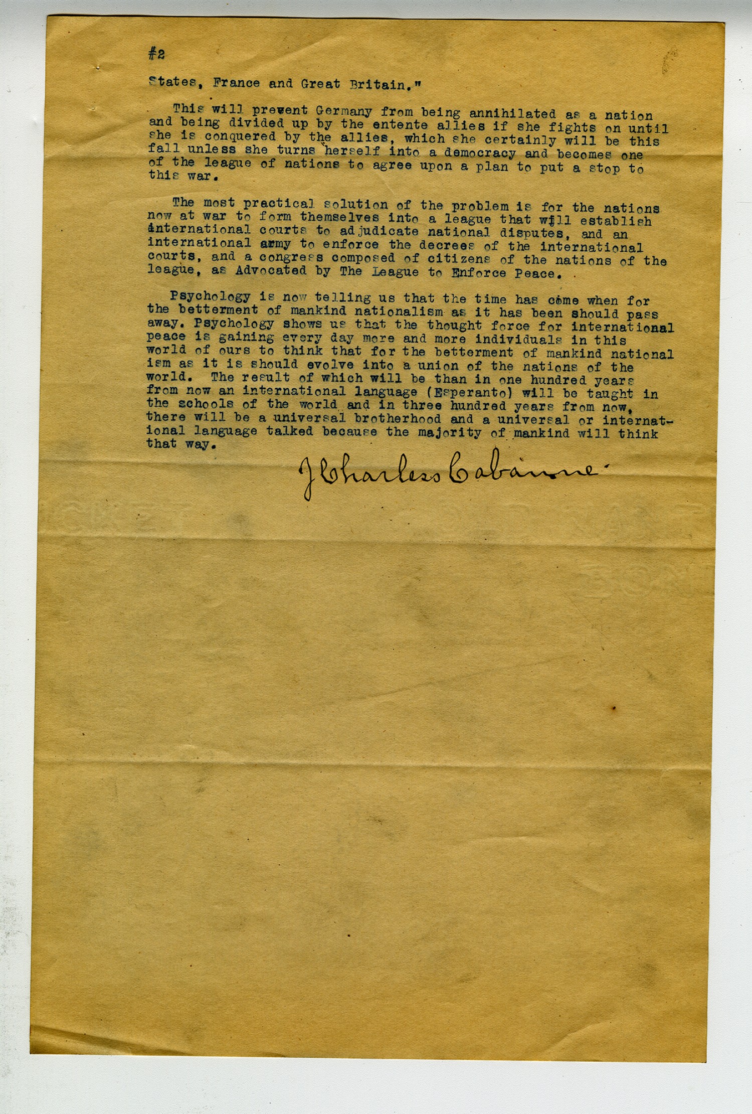 | Description | Letter to Mrs. Nettie Beauregard from her Uncle J Charles Cabanne stating that he had enclosed an article he wrote entitled "This War." Cabanne explained that he had sent the article to several newspapers and magazines but said they refused to publish it because it was pro-German. |