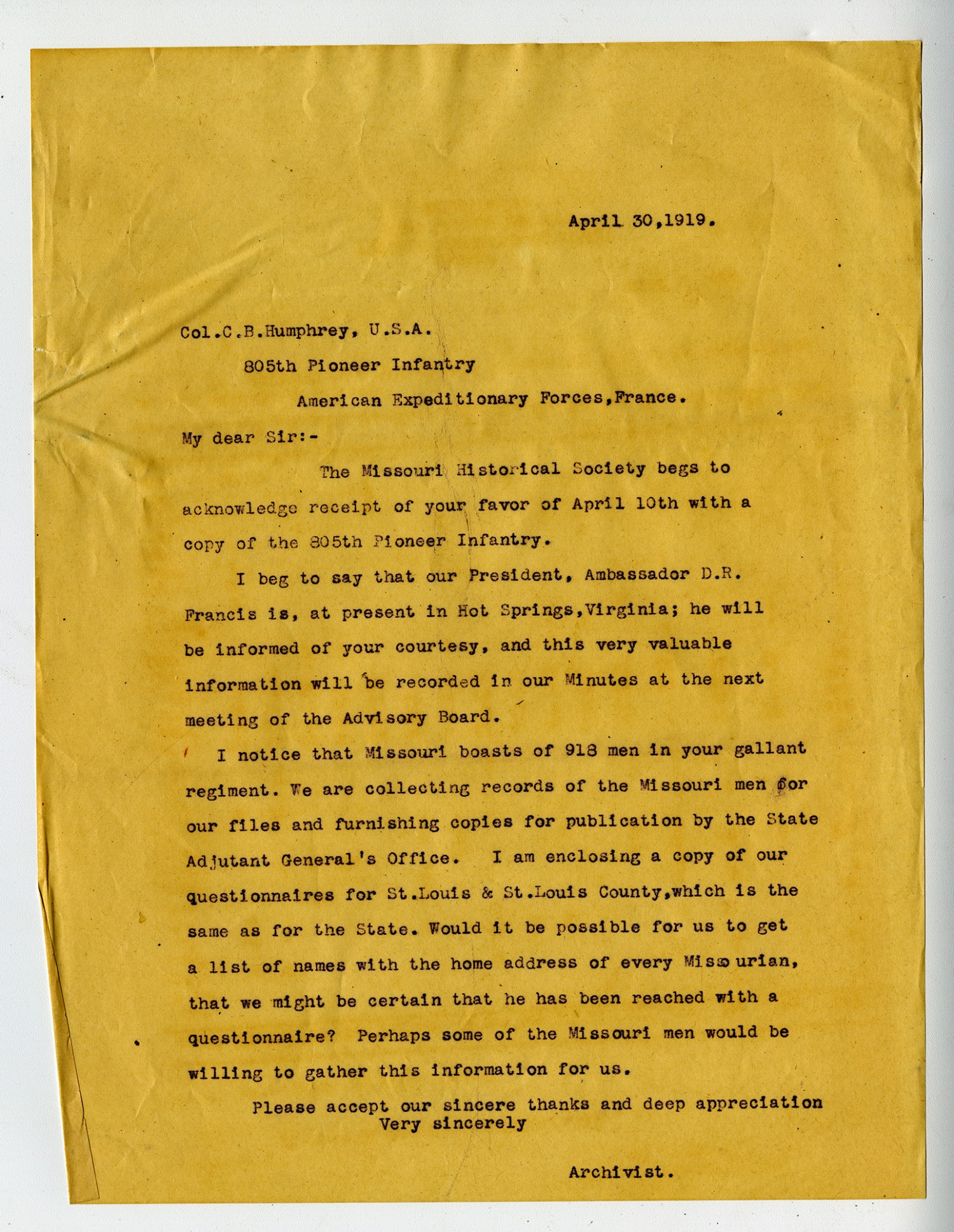 April 30, 1919. Col. C.B. Humphrey, U.S.A. 805th Pioneer Infantry American Expeditionary Forces, France. My dear Sir:- The Missouri Historical Society begs to acknowledge receipt of your favor of April 10th with a copy of the 805th Pioneer Infantry. I beg to say that our President, Ambassador D.R. Francis is, at present in Hot Springs, Virginia; he will be informed of your courtesy, and this very valuable information will be recorded in our Minutes at the next meeting of the Advisory Board. I notice that Missouri boasts of 918 men in your gallant regiment. We are collecting records of the Missouri men for our files and furnishing copies for publication by the State Adjutant General