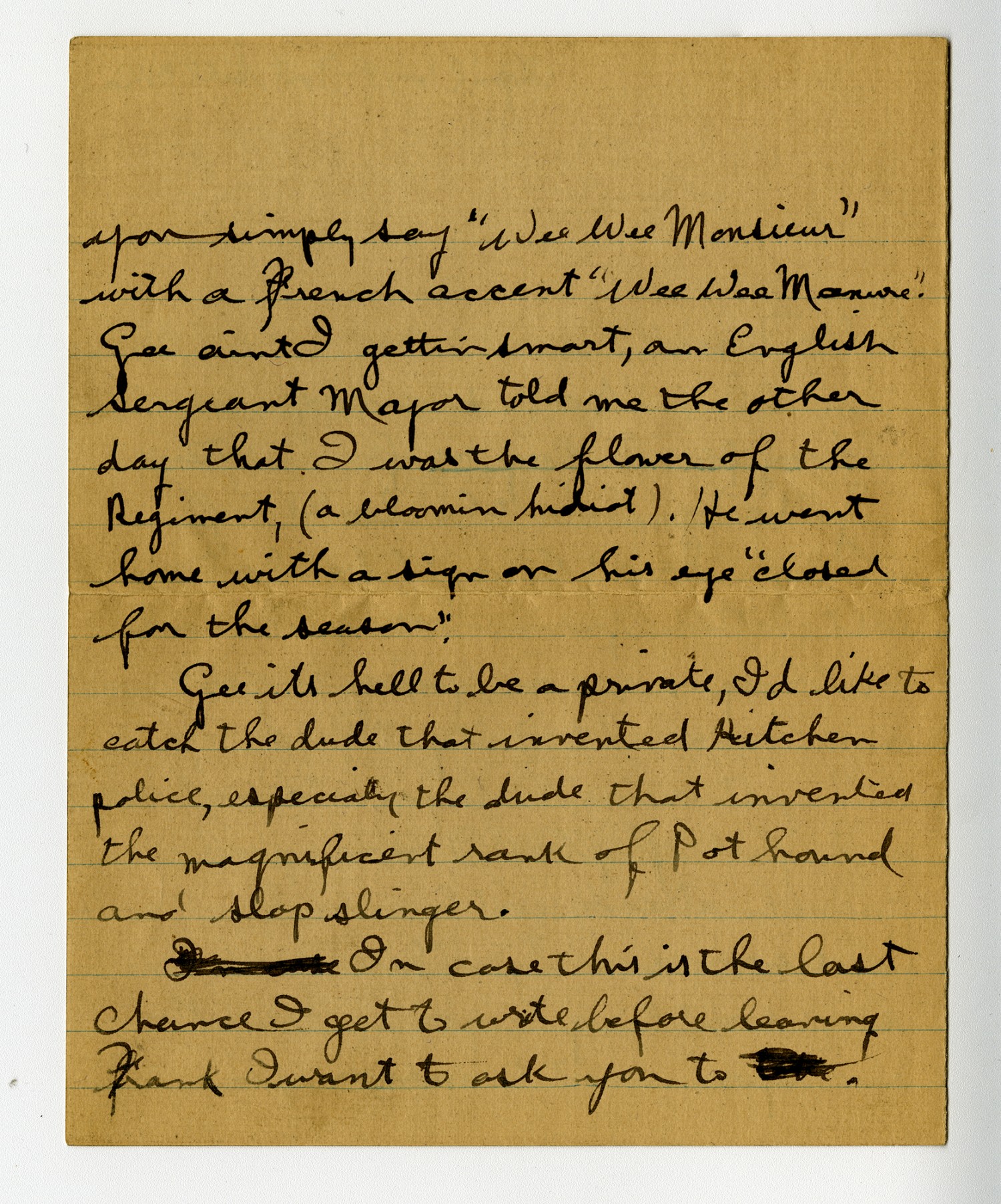 | Description | Private Edward W. Meier of St. Louis, Missouri, served with the 138th Infantry during World War One. Meier wrote his cousin-in-law Frank Baebler, also of Saint Louis, several humerous letters during the War. In this letter, Meier described his time at Fort Sill. |