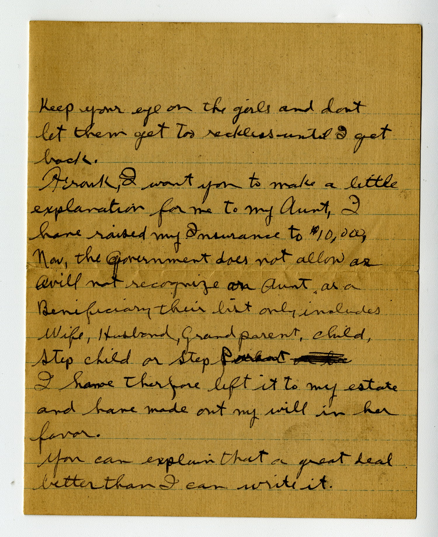 keep your eye on the girls and dont let them get too reckless until I get back. Frank, I want you to make a little explanation for me to my Aunt, I have raised my Insurance to $10,000, Now, the Government does not allow as Ovill not recognize on Aunt, or a Benificiary their list only includes Wife, Husband, Grandparent, child, Step child or Step Parent I have therefore left it to my estate and have made out my will in her favor. You can explain that a great deal better than I can write it.