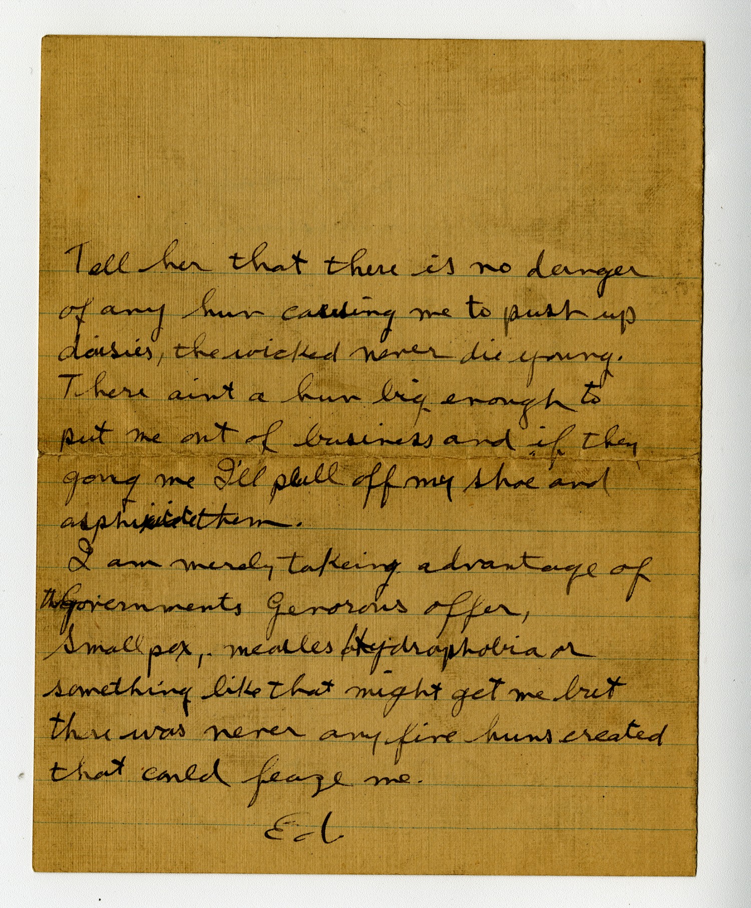Tell her that there is no danger of any hun calling me to push up daisies, the wicked never die young. There aint a hun big enough to put me out of business and if they gong me I