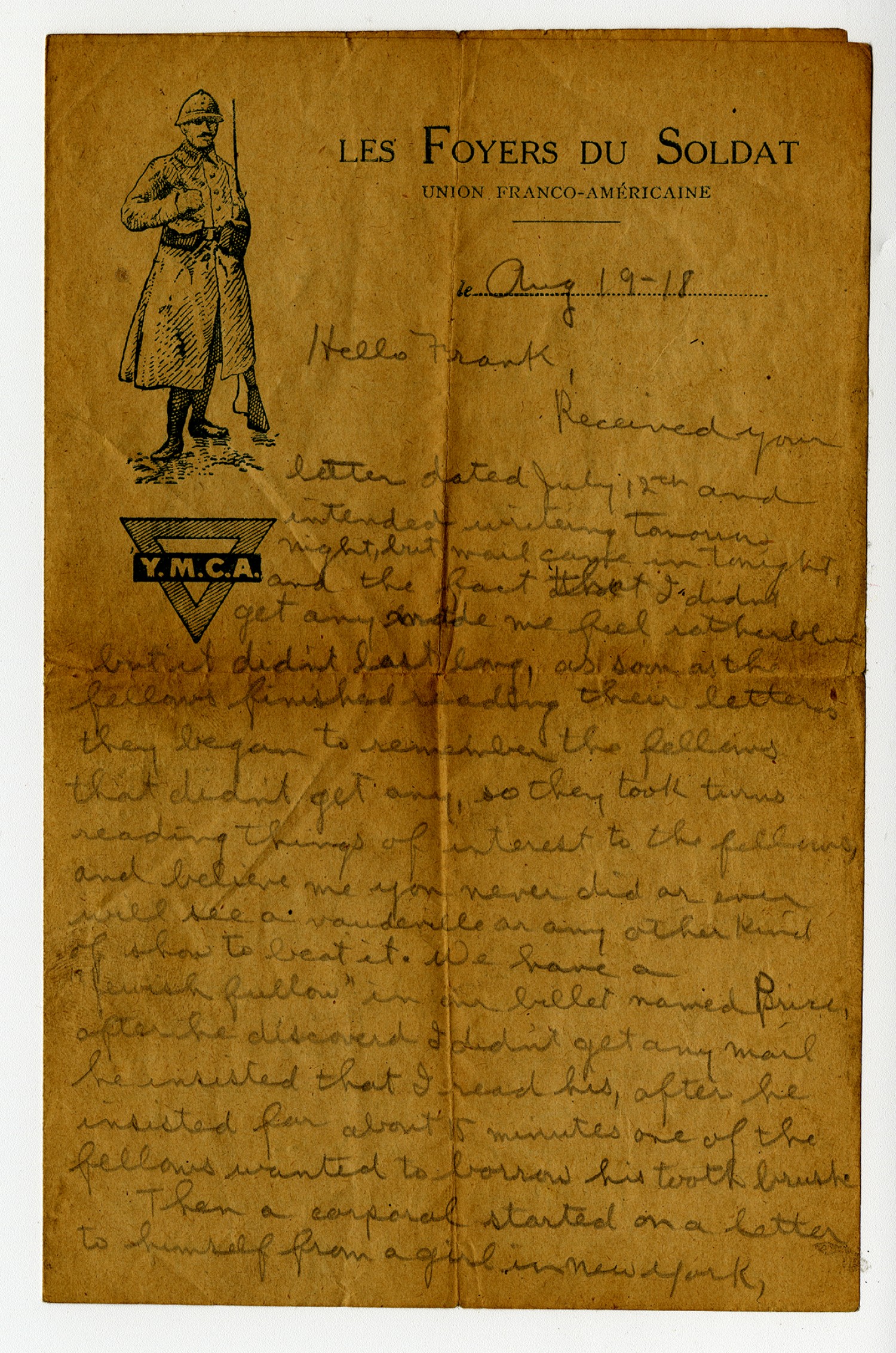 [August] 19-[1918] Hello Frank, Received your letter dated July 12th and intended writing tomorrow night, but mail came in tonight, and the fact that I didn
