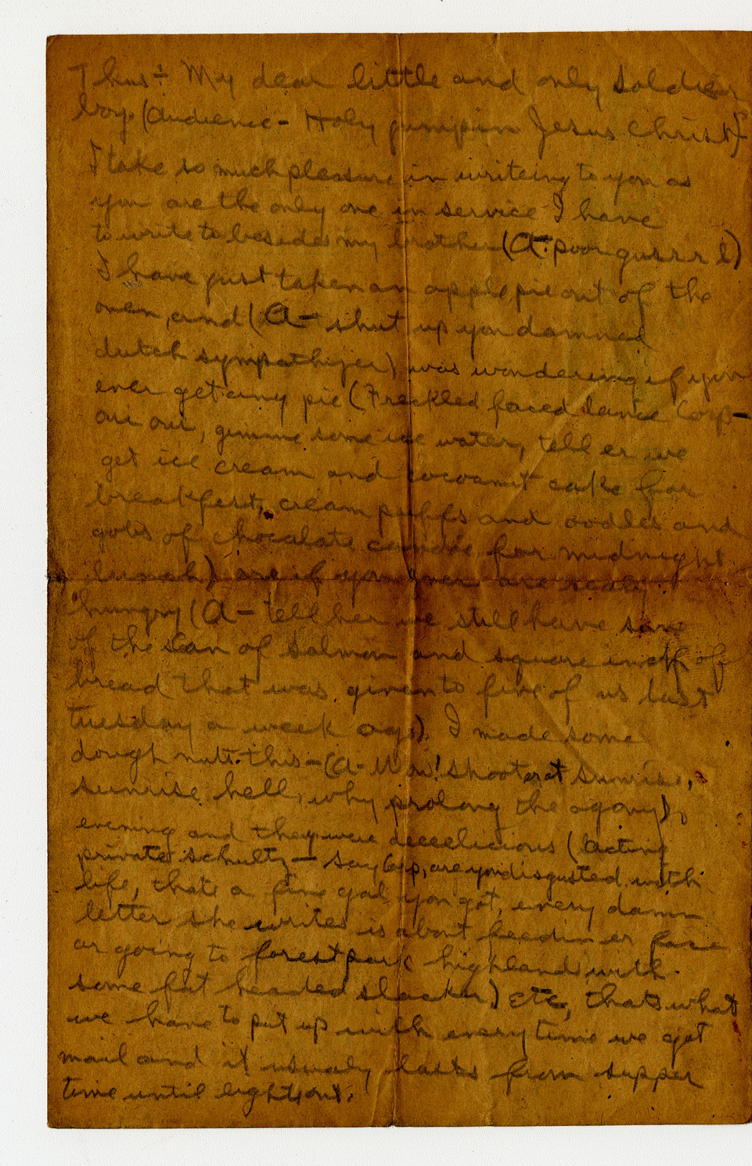 Thus- My dear little and only Soldier boy (Audience- Holy jumpin Jesus Christ) I take so much pleasure in writeing to you as you are the only one in service I have to write to besides my brother (A- poor gurrrl) I have just taken an apple pie out of the oven, and ( A- shut up you damned dutch sympathizer) was wondering if you ever get any pie (Freckled faced lance Corp- oui oui, gimmie some [m.s. illegible: 1 wd] water, tell er we get ice cream and coconut cake for breakfest, cream puffs and oodles and gobs of chocolate candie for midnight lunch) are if you ever are realy hungry (A-tell her we still have some of the can of Salmon and square inch of bread that was given to five of us last tuesday a week ago). I made some doughnuts this -(A- Wow! shooter at Sunrise, Sunrise hell, why prolong the agony) evening and they were deeeelicious (Acting private Schultz- Say Corp, are you disgusted with life, that a fine gal you got, every damn letter she writes is about feedin or fare or going to forest park highlands with some fat headed slacker) Etc, thats what we have to put up with every time we get mail and it usualy last from supper time until lights out.